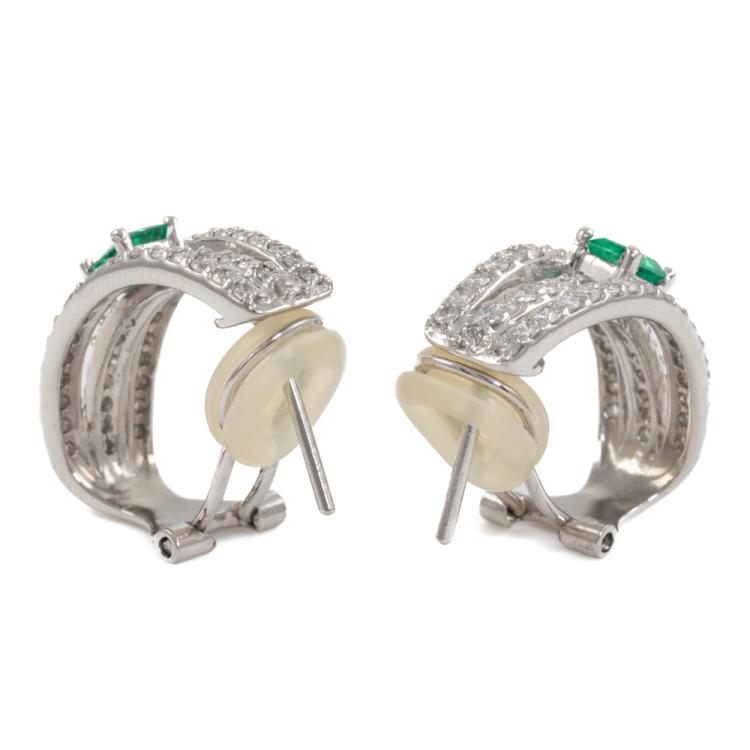Emerald and Diamond clip on earrings (for pierced ears) with emerald cut natural Emeralds totalling 0.44ct and round natural Diamonds totalling 1.00ct (Estimated grading: G-H SI). Platinum 900. Weight: 9.6g. (Pre-owned)