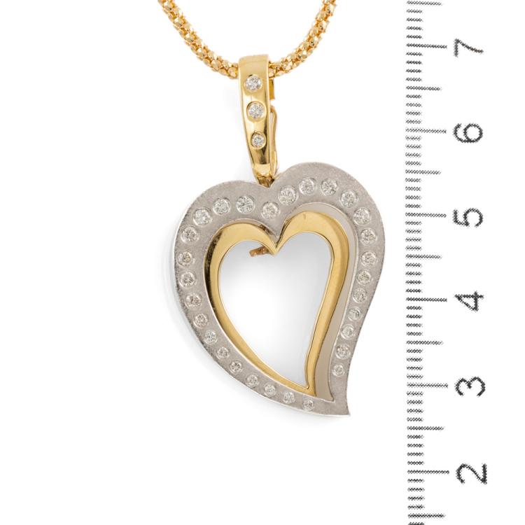 Heart design enhancer pendant with round natural Diamonds totalling approximately 0.50ct (Estimated grading: I-J SI). 18ct yellow & white gold with 18ct yellow gold adjustable 60cm chain. Weight: 16.5g. (Pre-owned)