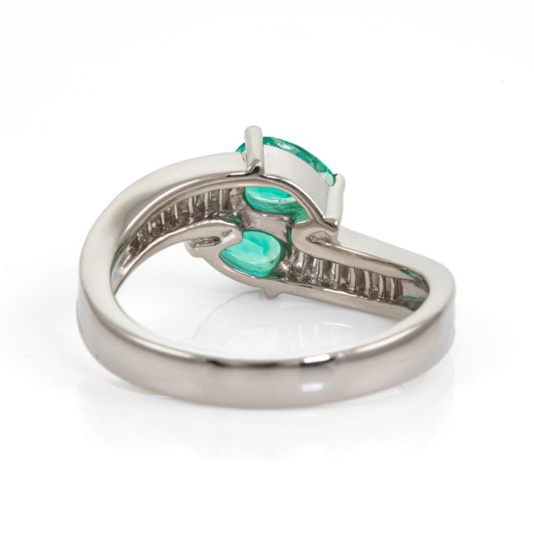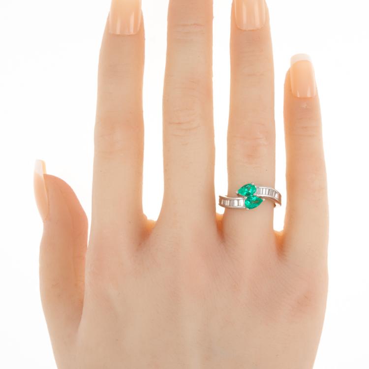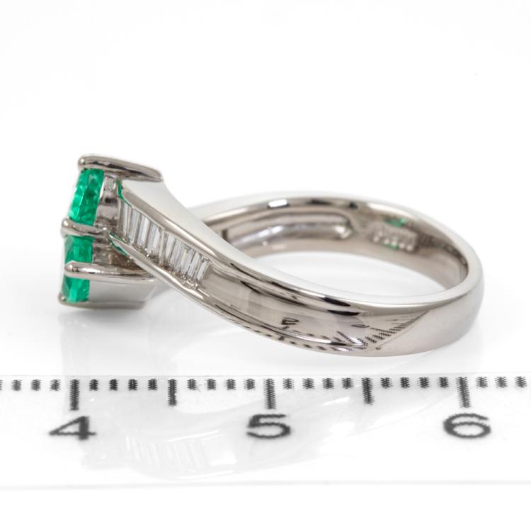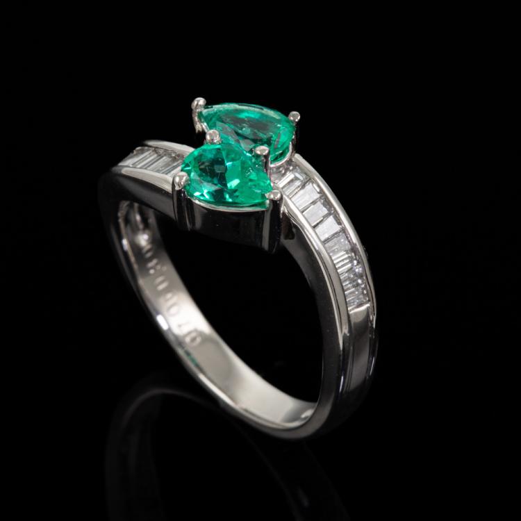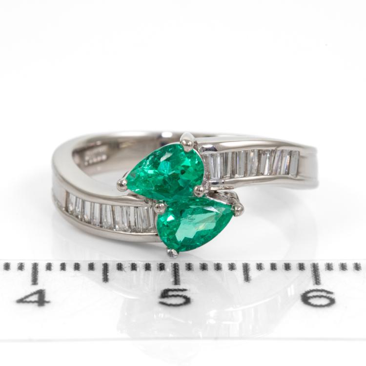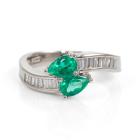 Emerald and Diamond ring with pear shape natural Emeralds totalling 0.70ct and baguette cut natural Diamonds totalling 0.30ct (Estimated grading: H-I SI). Platinum 900. Ring size K1/2 - ring resizing is not recommended. Band width: 2.9mm - 3.8mm. Weight: 6.2g. (Pre-owned)