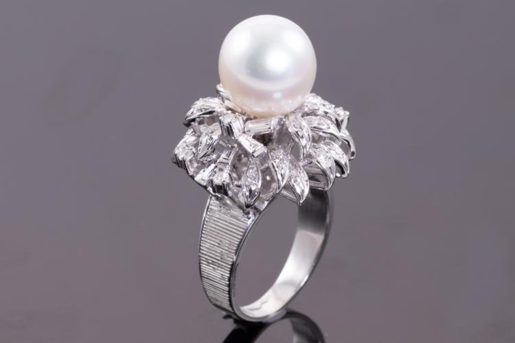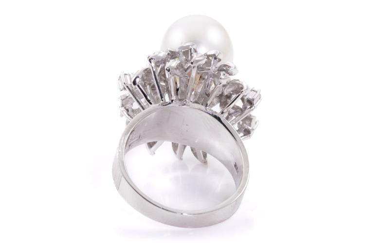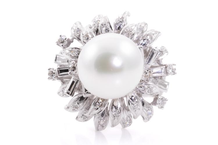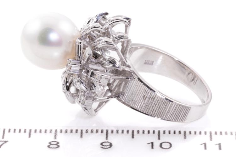 Pearl and Diamond ring with South Sea Pearl of 11.4mm with round Natural Diamonds totalling 0.35cts (Estimated grading: H SI-P1). 18ct white gold. Ring size N1/2. Weight: 11.8g (Pre-owned)