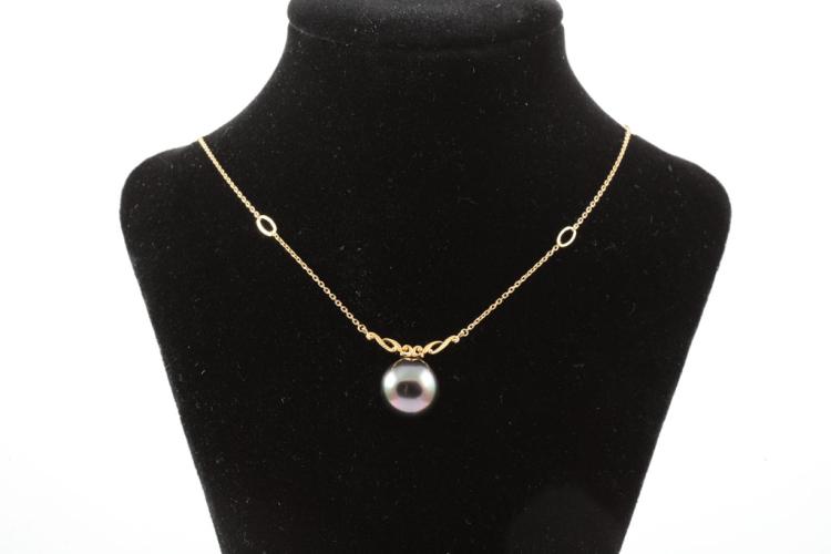Pearl pendant with a Tahitian Pearl of 11.9mm. 18ct yellow gold attached with 44cm 18ct yellow gold adjustable chain. Weight: 5.0g. (Pre-owned)^