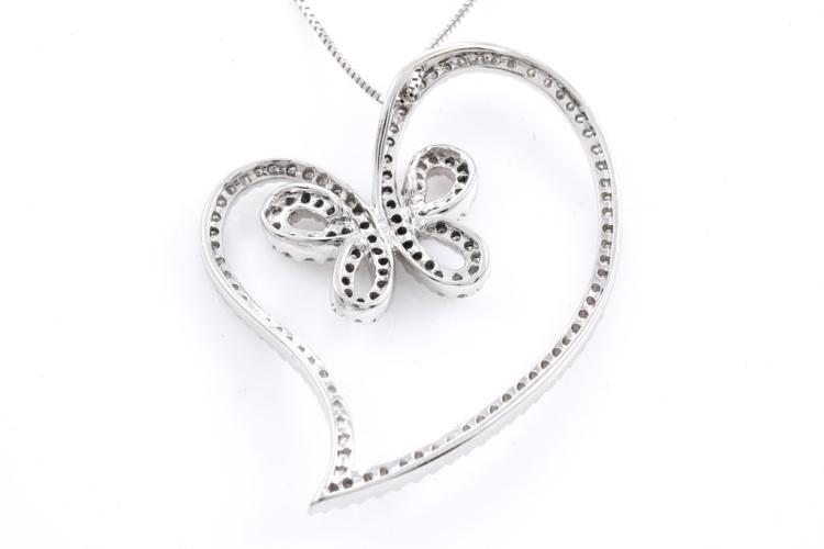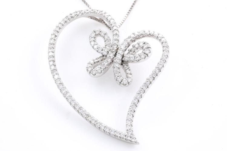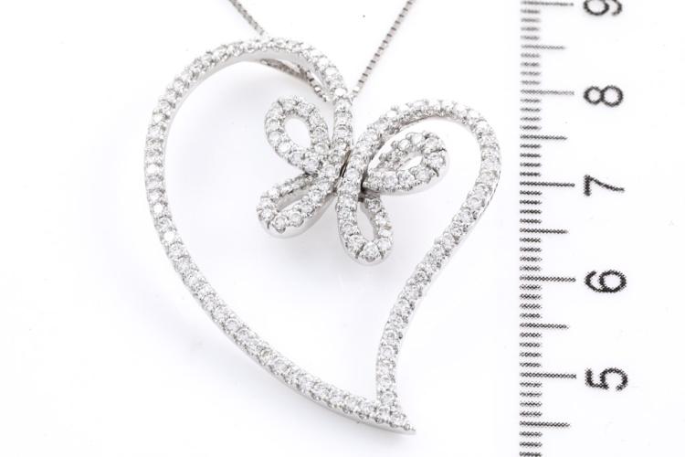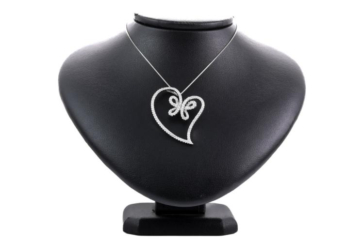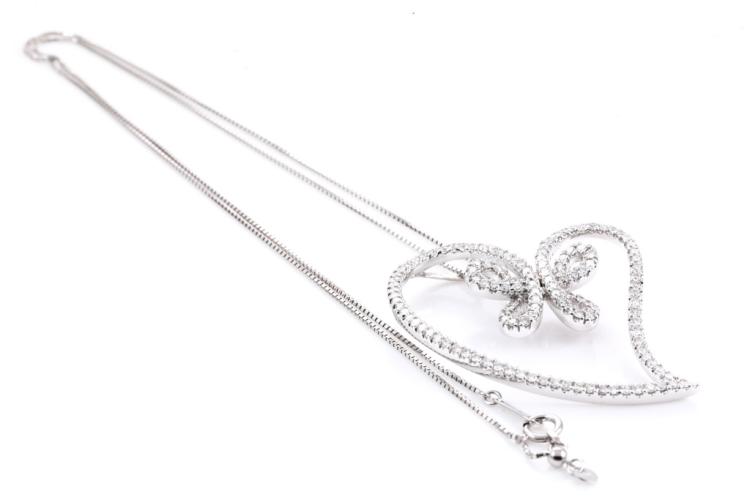 Diamond heart designed pendant with round natural Diamonds totalling 1.45cts (Estimated grading: H SI). 18ct white gold with 18ct white gold adjustable 44cm chain. Length: 44cm. Weight: 8.9g. (Pre-owned)