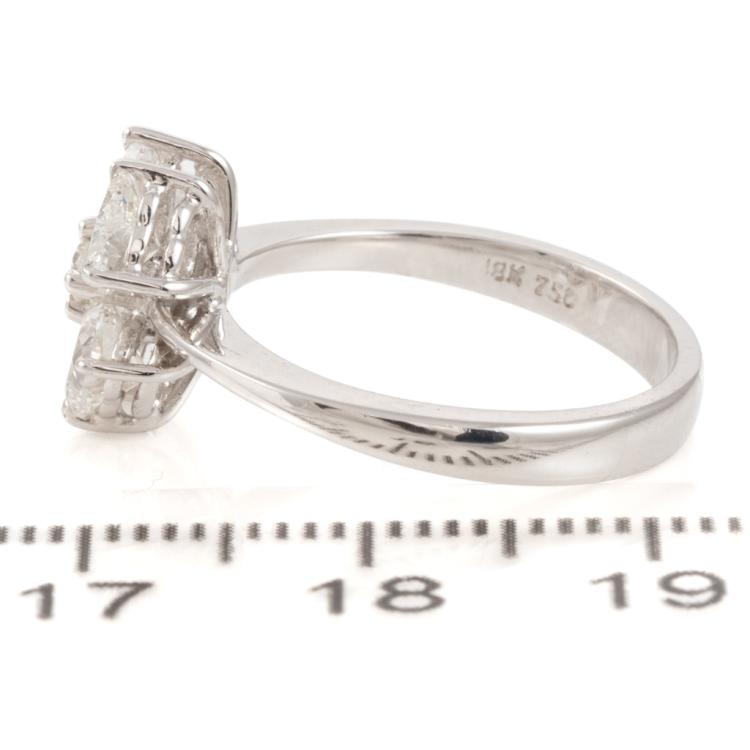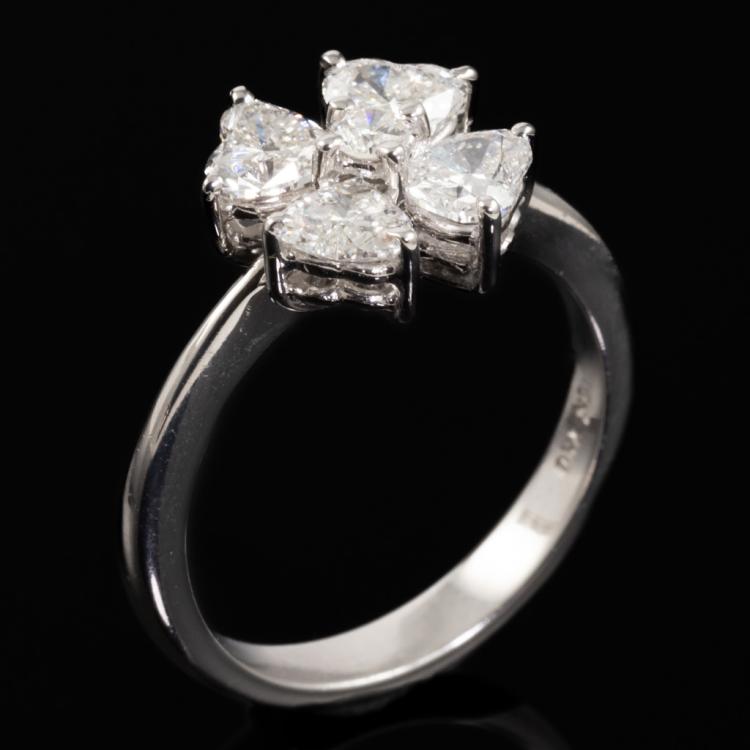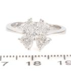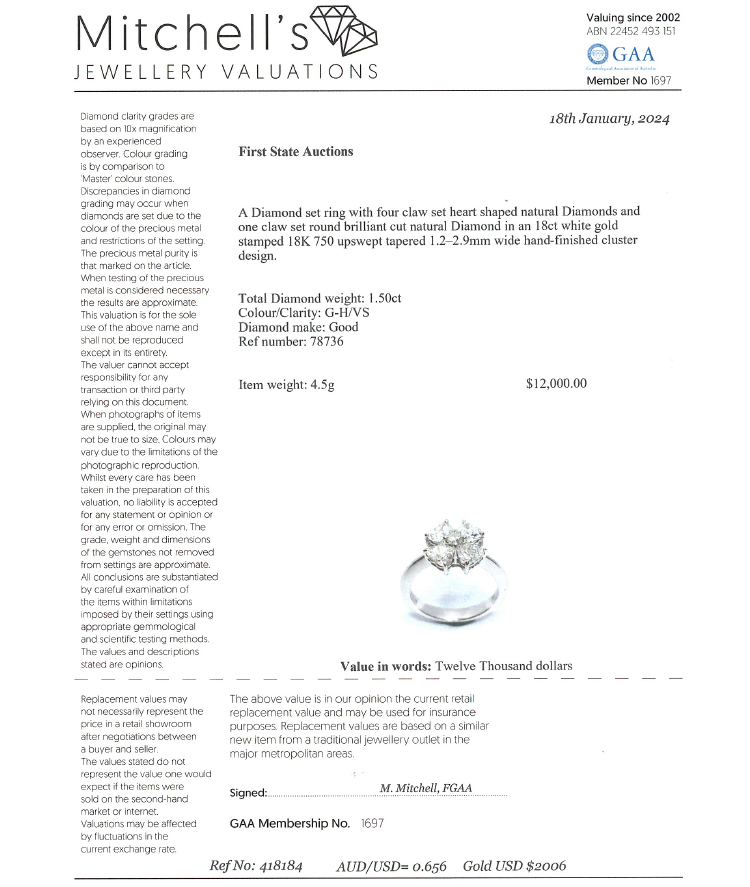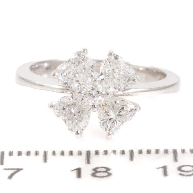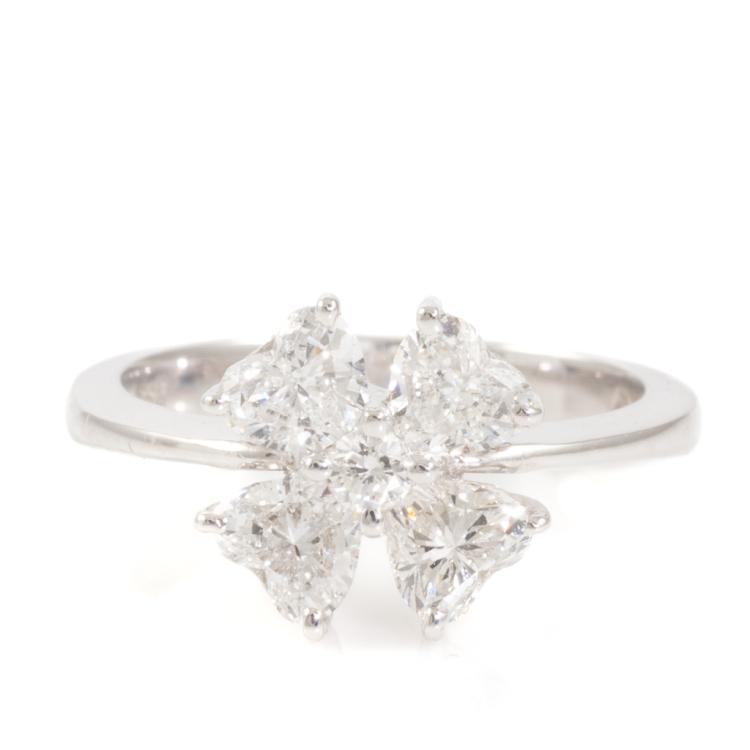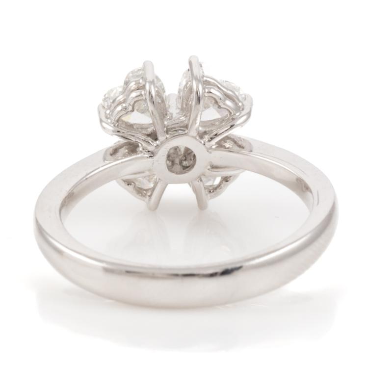 Diamond flower design dress ring with round & heart shape Natural Diamonds totalling 1.50ct (Estimated grading: G-H VS). 18ct white gold. Ring size: K. Band width: 2.9mm - 1.2mm. Weight: 4.5g. With Valuation Certificate #418184. (Pre-owned)