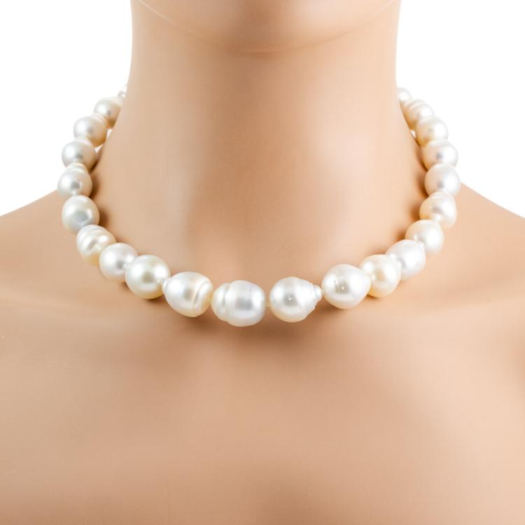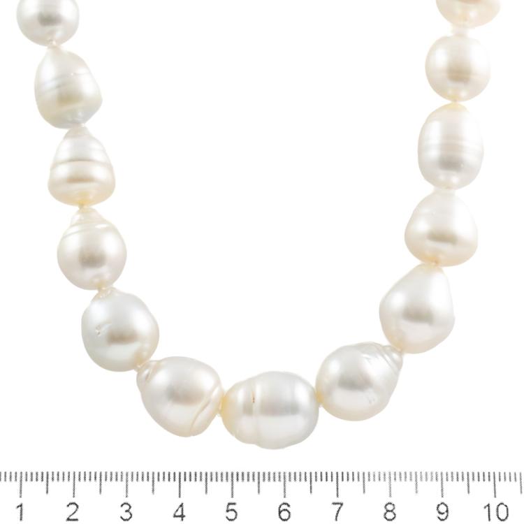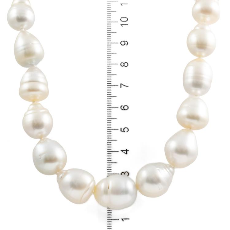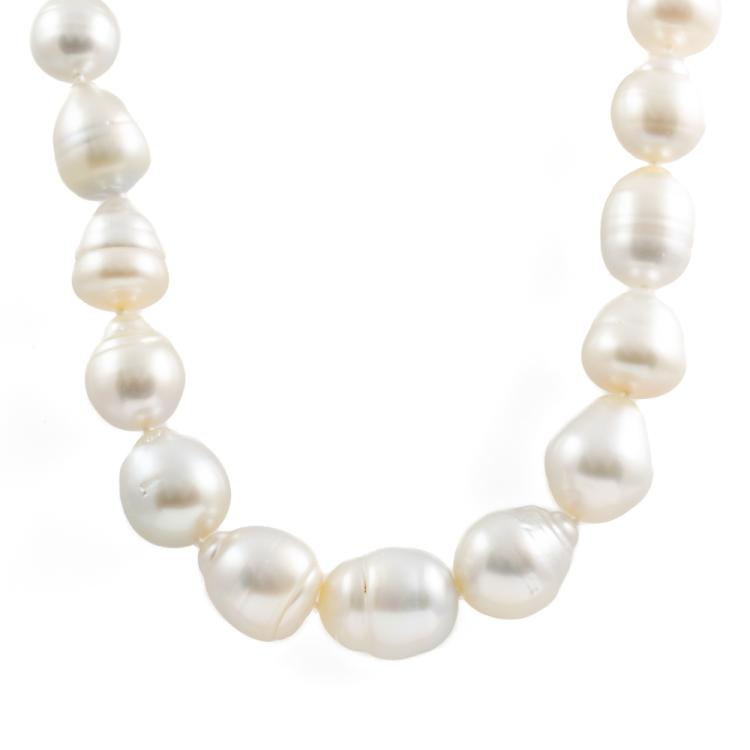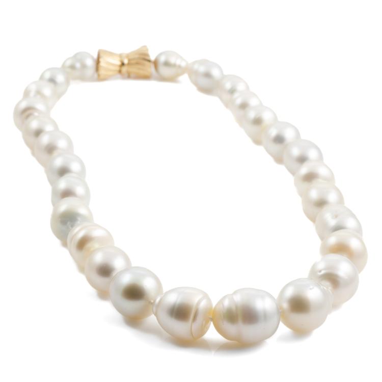 Pearl necklace with 27 graduated baroque South Sea Pearls of 15.3mm-10.6mm. 14ct yellow gold clasp. Length: 45cm. Weight: 99.9g. (Pre-owned)