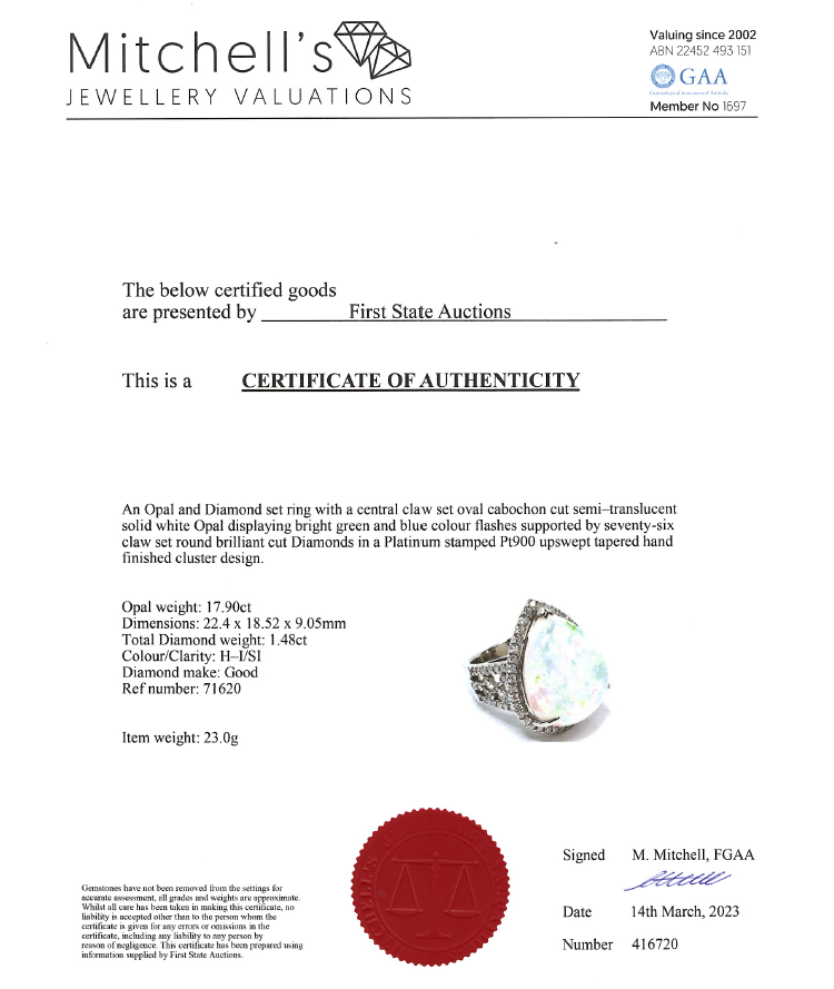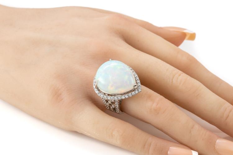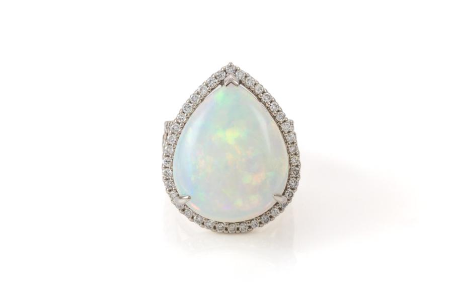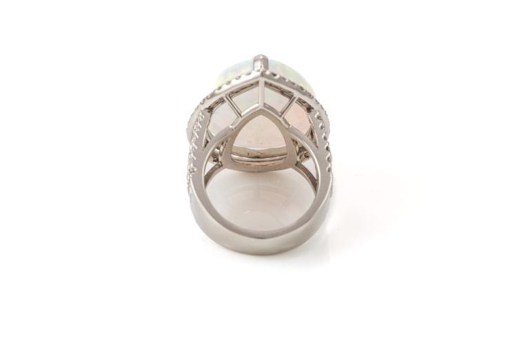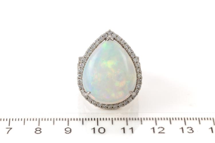 Opal and Diamond ring with pear shape cabochon cut solid white Opal of 17.90ct and round Diamonds totalling 1.48cts (Estimated grading: H-I SI). Platinum - 900. Ring size M1/2 - ring resizing is not recommended. Weight: 23.0g. With Certificate #416720. (Pre-owned)