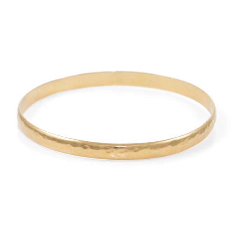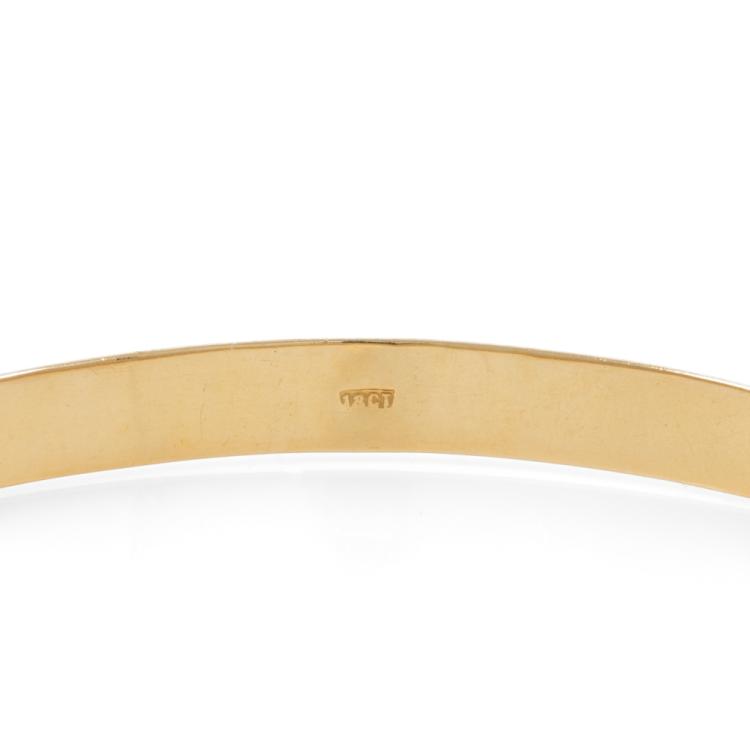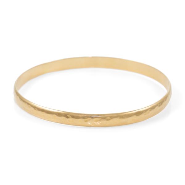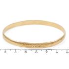 Solid 18ct yellow gold indented pattern slip on bangle. Weight: 19.5g. Circumference: 21.0cm. Width: 5.5mm. (Pre-owned)
