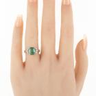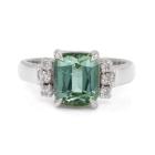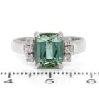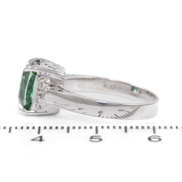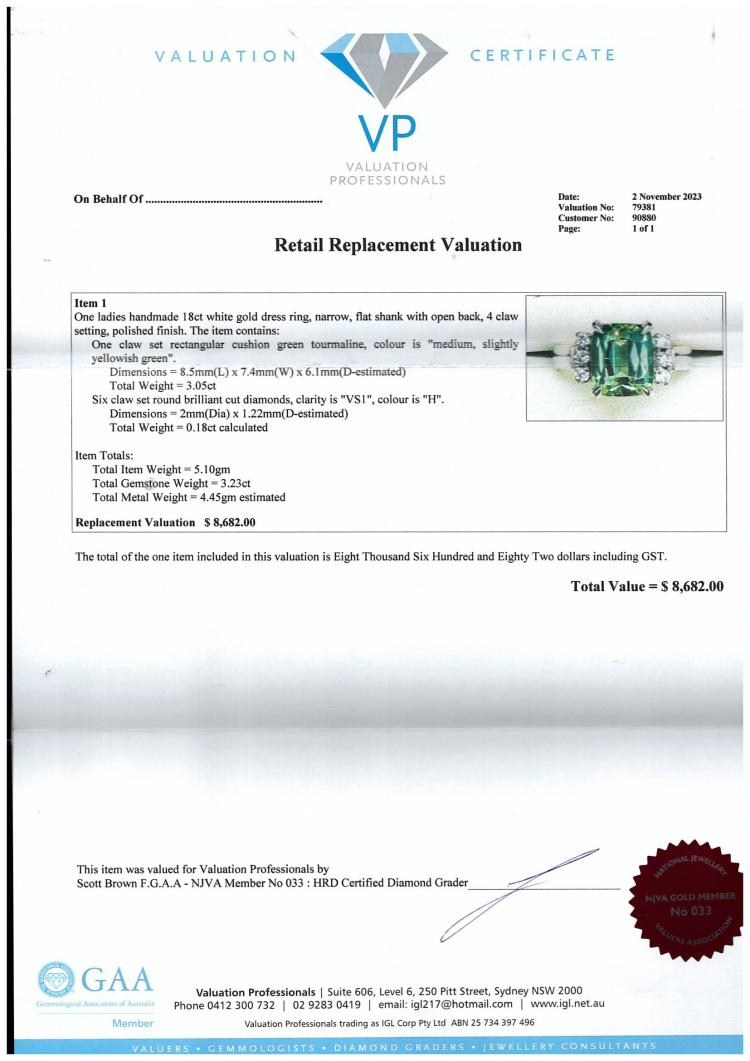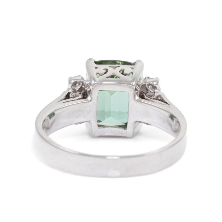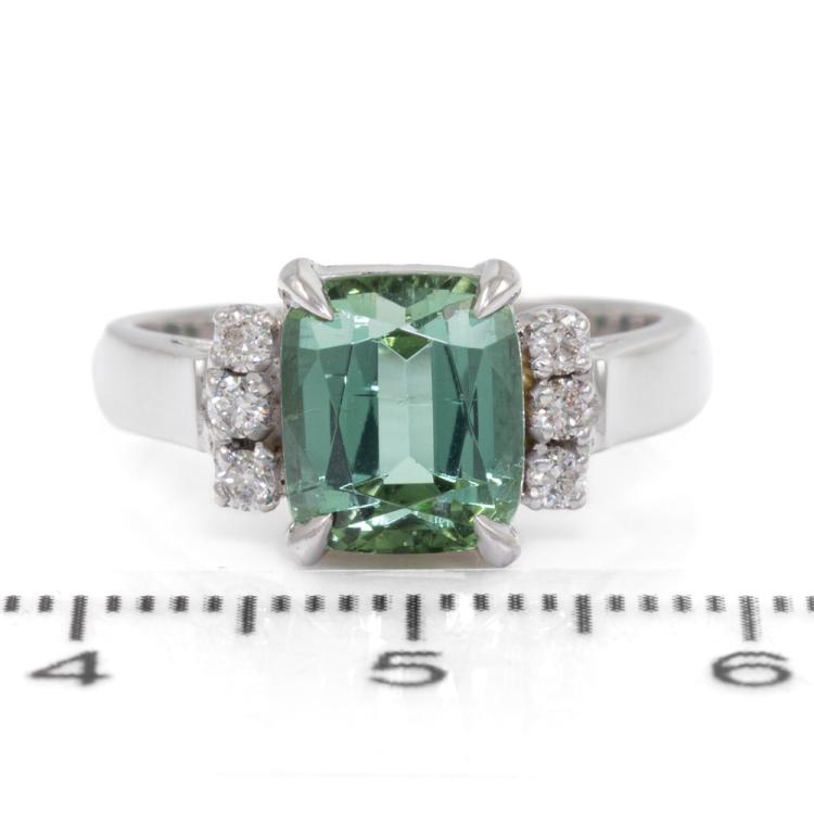 Tourmaline and Diamond ring with rectangular cushion cut natural green Tourmaline of 3.05ct and round natural Diamonds totalling 0.18ct. 18ct white gold. Ring size L. Band width: 2.8mm - 3.1mm. Weight: 5.1g. With Valuation Certificate 79381. (Pre-owned)