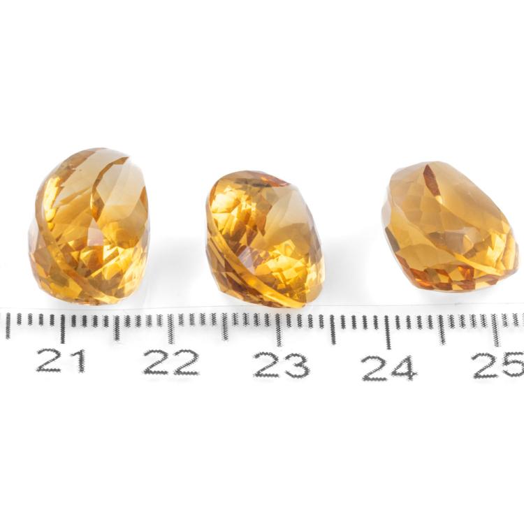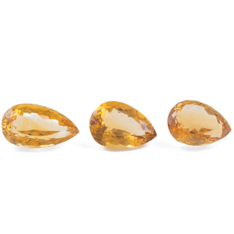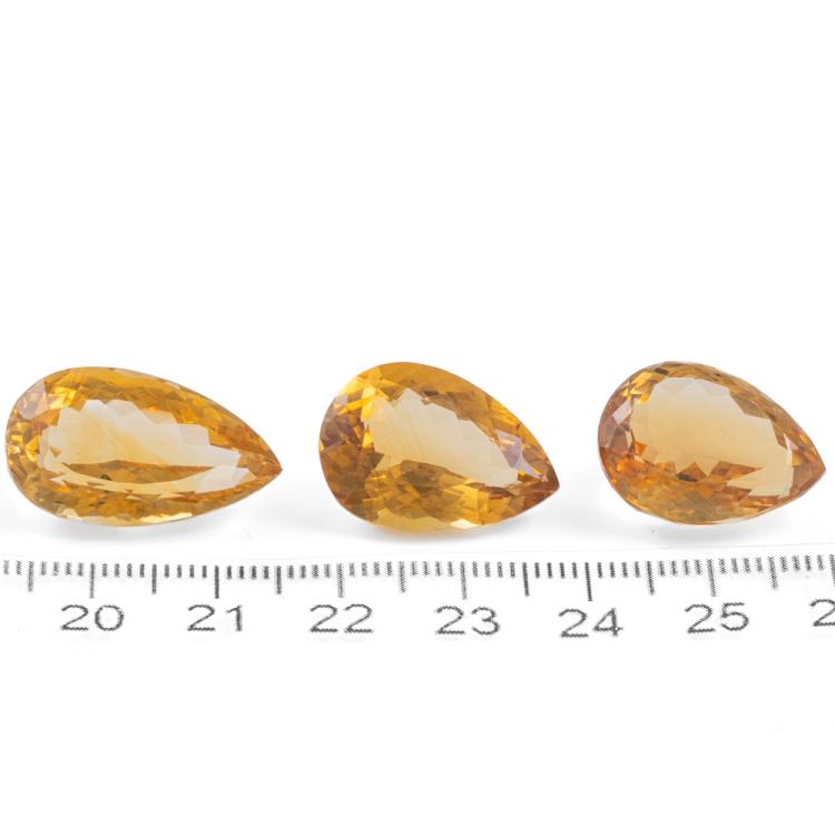 3 Loose pear shape Natural Citrine totalling 45.86ct. 3 stones weighing: 12.64ct (Approx. size: 20.1mm x 14.0mm x 8.7mm), 15.44ct (Approx. size: 18.8mm x 14.3mm x 9.5mm), 17.75ct (Approx. Size: 22.9mm x 13.1mm x 10.7mm) (As New)^