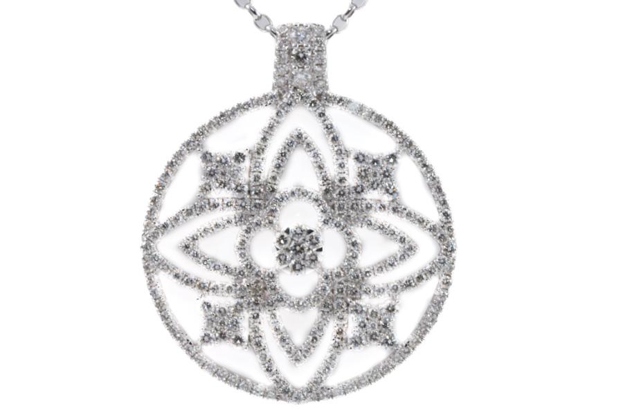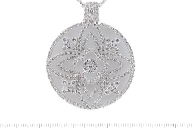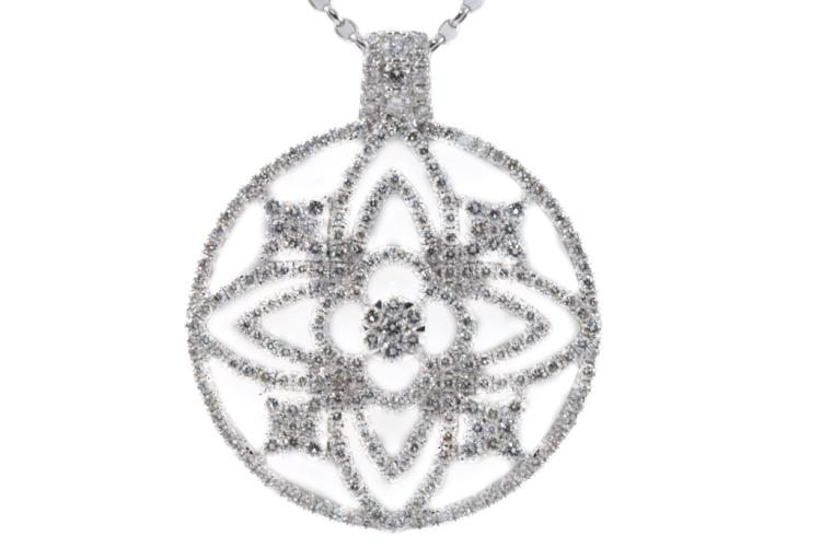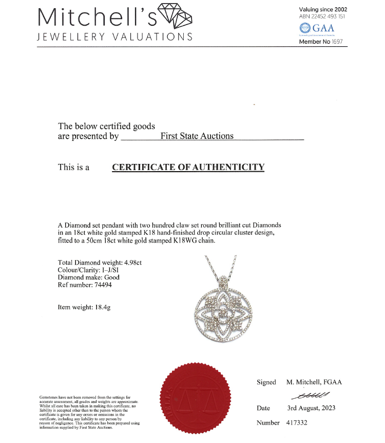 Diamond dress pendant with round Natural Diamonds totalling 4.98ct (Estimated grading: I-J SI). 18ct white gold with 50cm 18ct white gold chain. Weight: 18.4g. With Certificate #417332. (Pre-owned)
