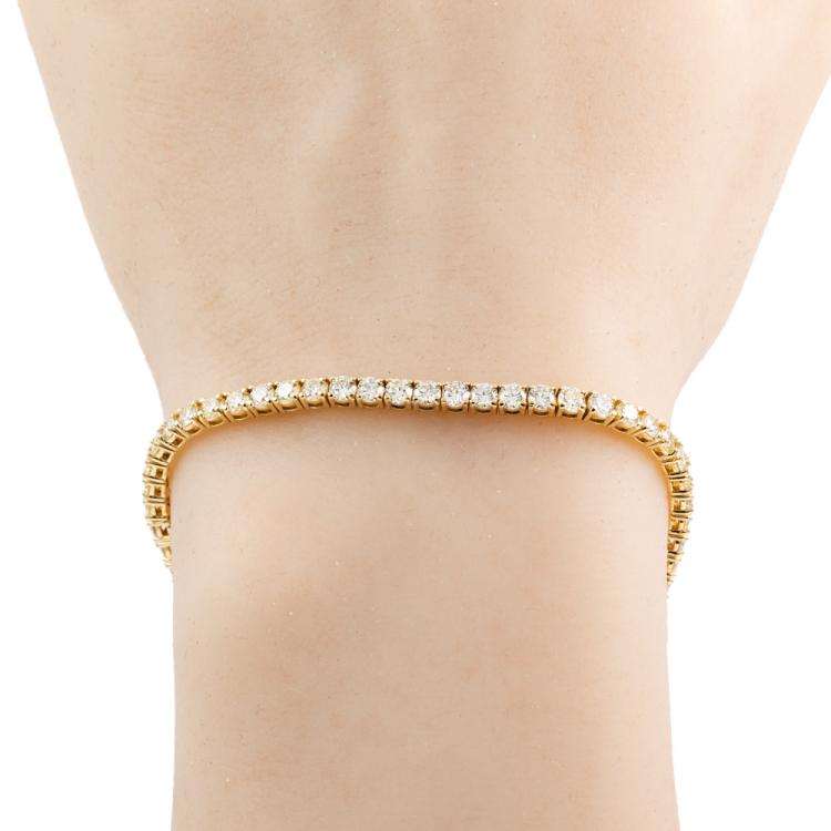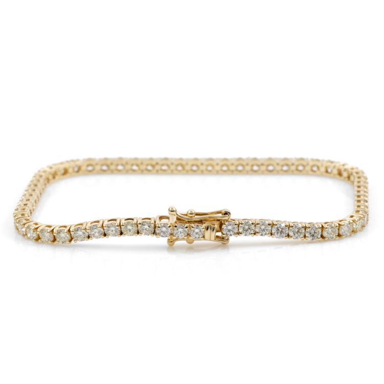Diamond tennis bracelet with 62 round brilliant cut Natural Diamonds totalling 5.15ct. (Estimated grading: K-L SI) 18ct yellow gold. Length: 18cm. Weight: 9.8g. With Valuation Certificate #418079. (New)