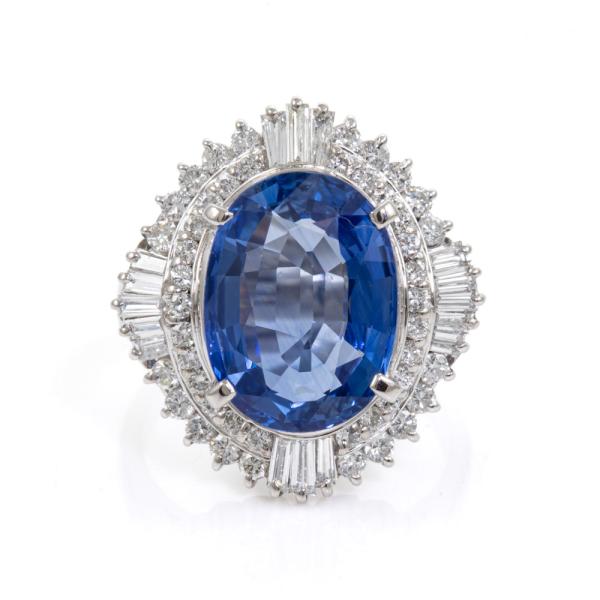 Sapphire and Diamond ring with oval shape Natural Sri Lankan cornflower blue Sapphire of 7.12ct and baguette cut & round Natural Diamonds totalling 1.15cts (Estimated grading: G-H SI). Platinum 900. Ring size L1/2. Band width: 2.7 - 4.8mm. Weight: 12.6g. With AIGS Report#GF23101885. (Pre-owned)
