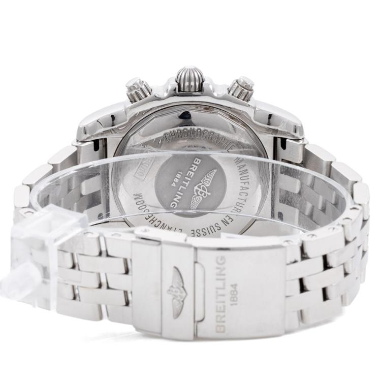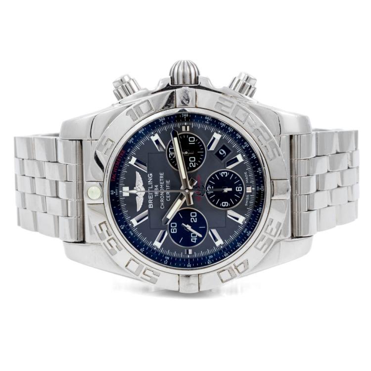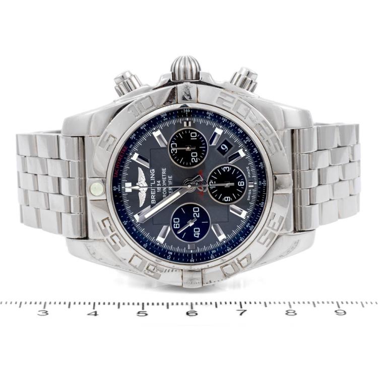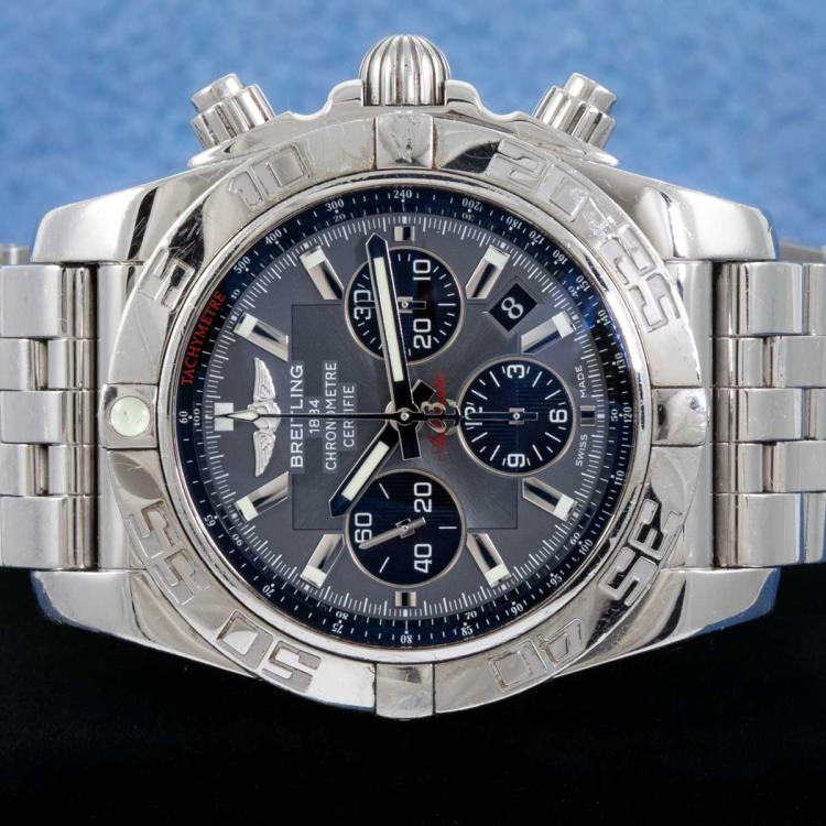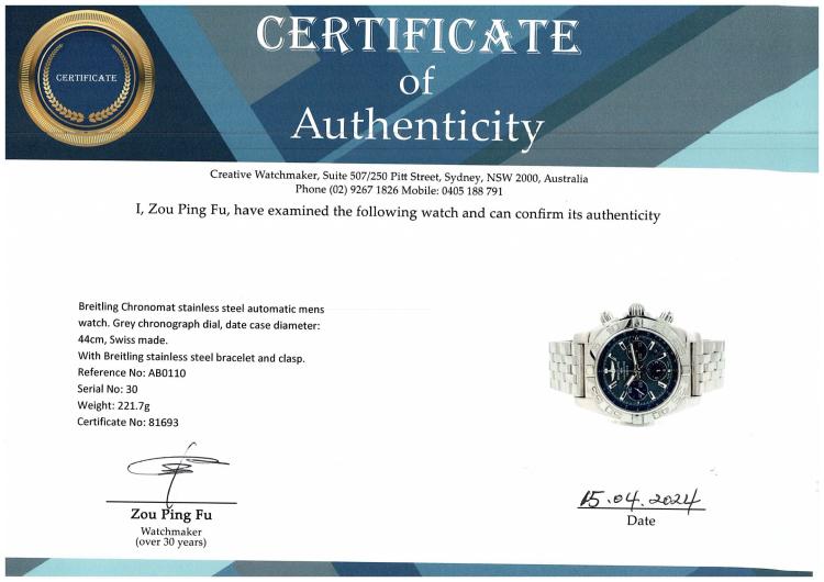 Breitling Chronomat stainless steel automatic mens watch. Grey chronograph dial, date case diameter: 44cm, wrist size: 20cm, Swiss made. Ref # AB0110. With Breitling stainless steel bracelet and clasp. With Certificate of Authenticity, Breitling International Warranty card dated 01/2015 and Breitling box. (Pre-owned)