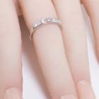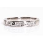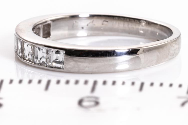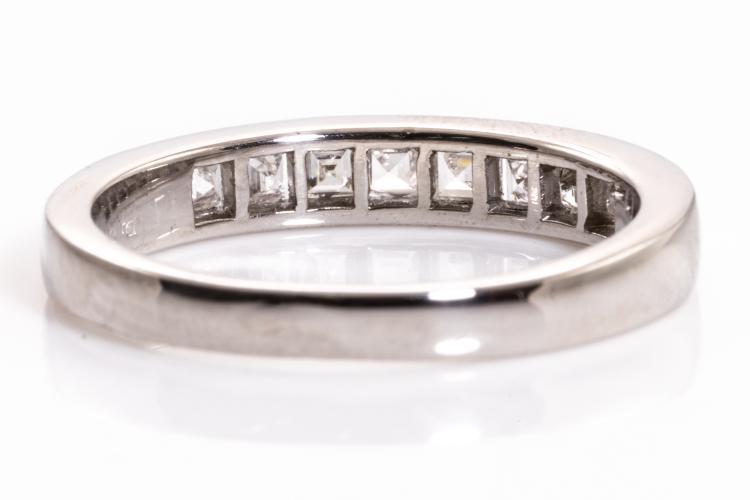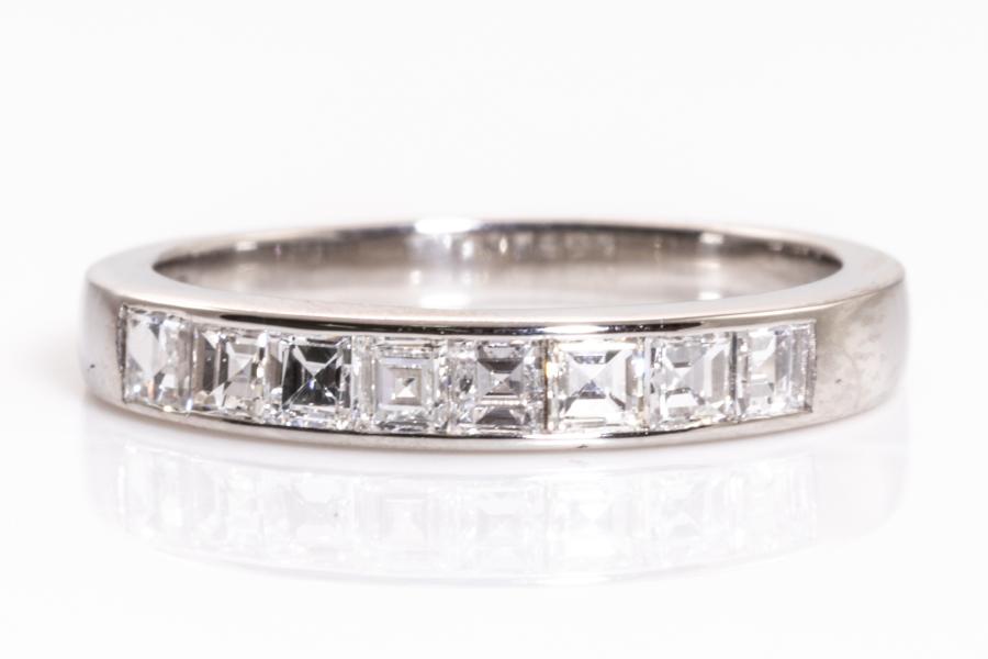 Diamond eternity ring with 8 carre cut Diamonds totalling 0.45ct (Estimated grading: H VS-SI). Platinum-900. Ring size J - ring resizing is not recommended. Weight: 3.8g. (Pre-owned)^