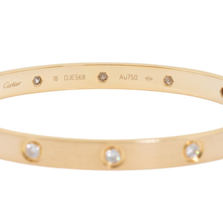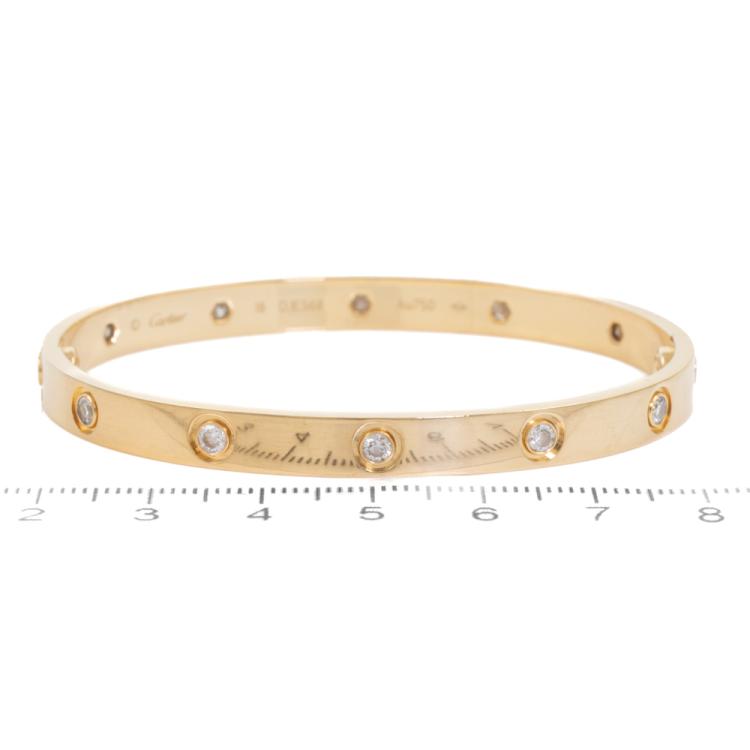 Cartier Love Bracelet with 10 round Natural Diamonds totalling 0.96cts (Estimated grading: F VS). 18ct yellow gold. Cartier stamped size 18. Width: 5.9mm. Weight: 30.7g. With Cartier certificate dated 14/03/17. With Cartier box, instruction booklet, screwdriver and 2 spare screws. (Pre-owned)