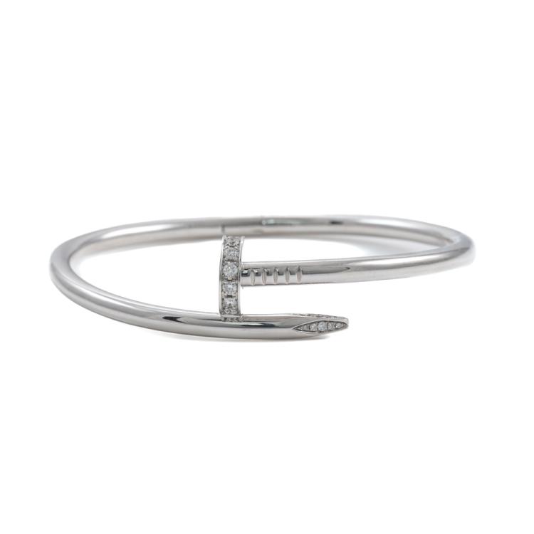 Cartier Juste un Clou bracelet, Classic Model with 32 round Natural Diamonds totalling 0.58ct (Estimated grading: F-G VS). Width: 3.5mm. 18ct white gold. Cartier stamped size 19. Weight: 33.4g. With Certificate #419768. (Pre-owned)