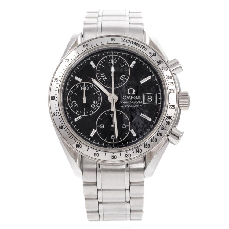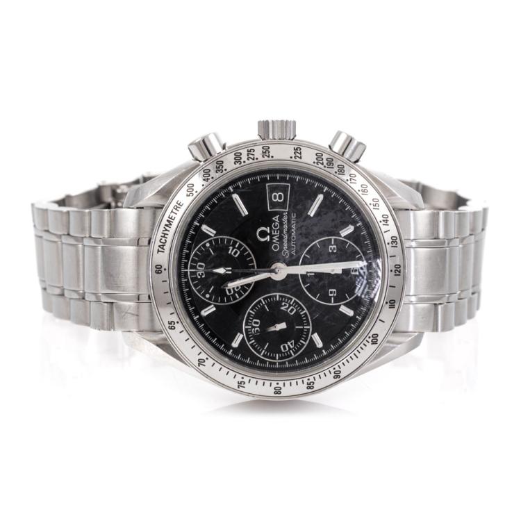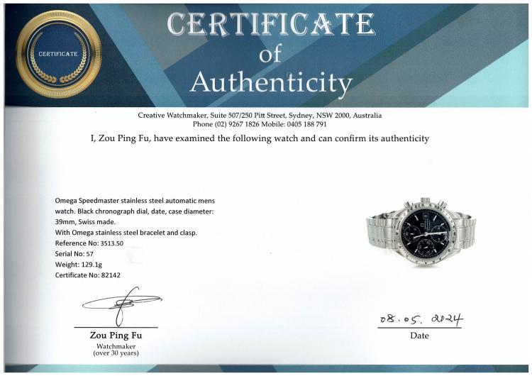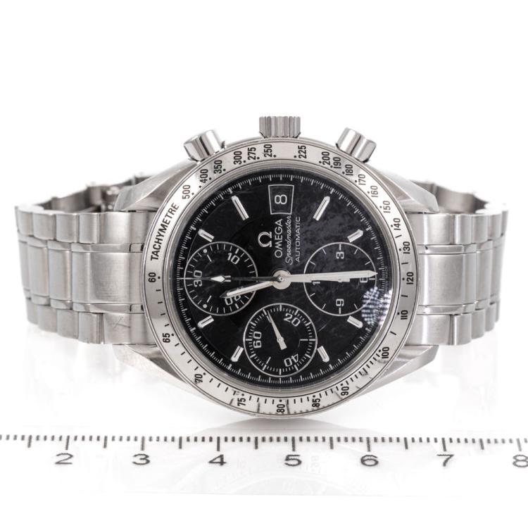 Omega Speedmaster stainless steel automatic mens watch. Black chronograph dial, date, case diameter: 39mm, wrist size: 18cm, Swiss made. Ref# 3513.50. With Omega stainless steel bracelet and clasp. With Certificate of Authenticity. 3 month FSA warranty (Pre-owned)