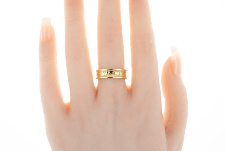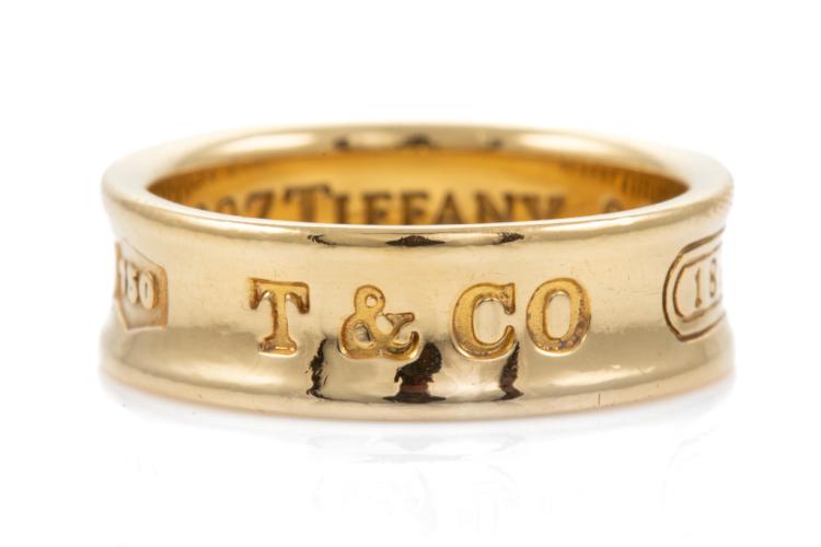 Tiffany & Co. 1837 ring. 18ct yellow gold. Ring size M - ring resizing is not recommended. Circa 1997. Width: 6.2mm. Weight: 7.2g. (Pre-owned)