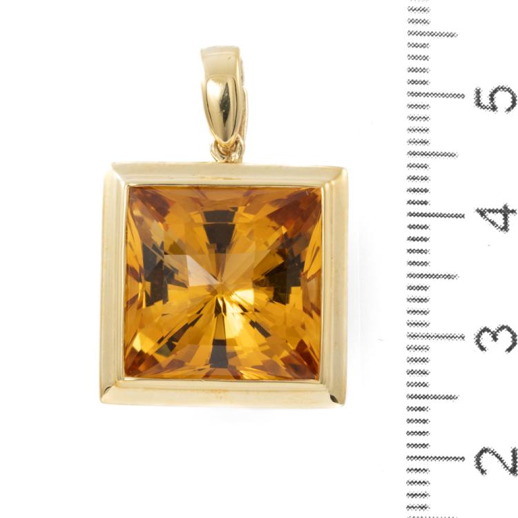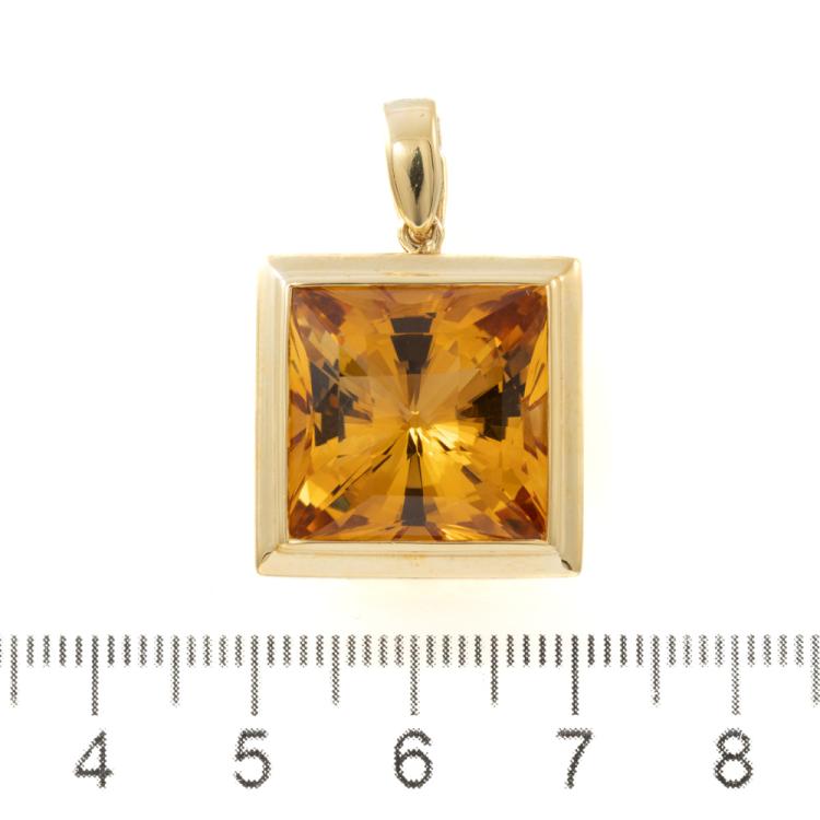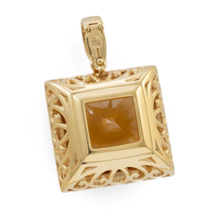 Citrine enhancer pendant with a checkerboard square cut natural Citrine of approximately 20.00ct. 18ct yellow gold. Size including bail: 3cm x 2cm. No chain provided. Weight: 11.7g. (Pre-owned)