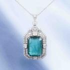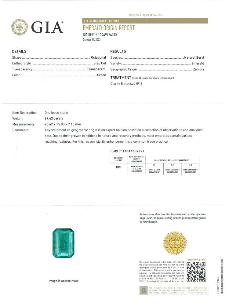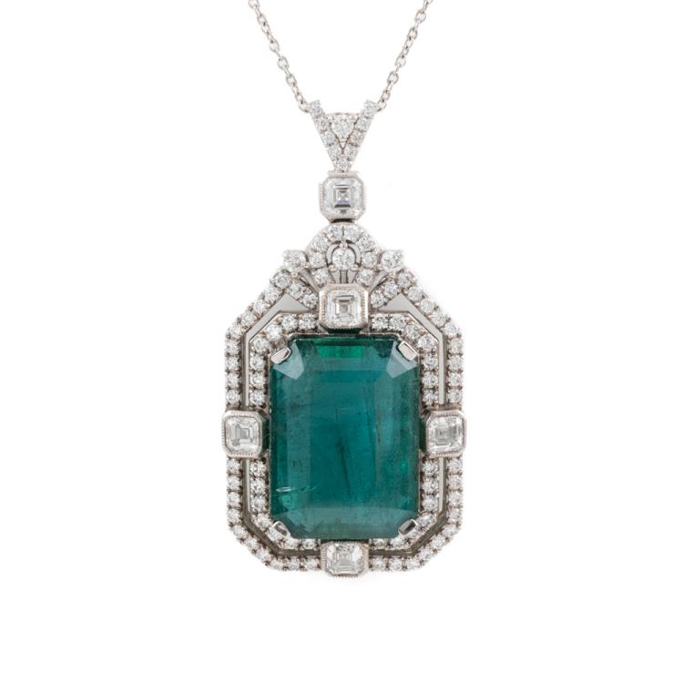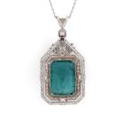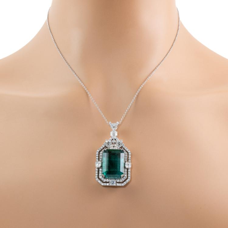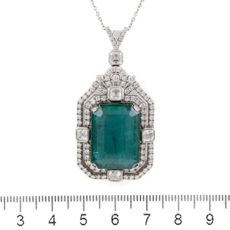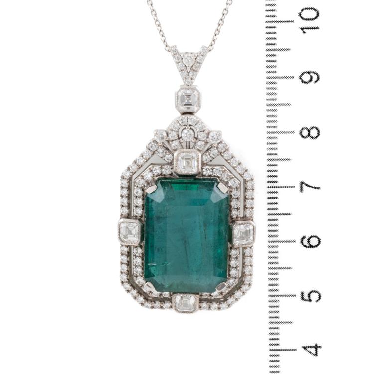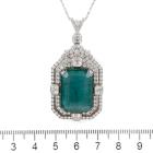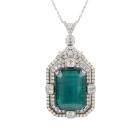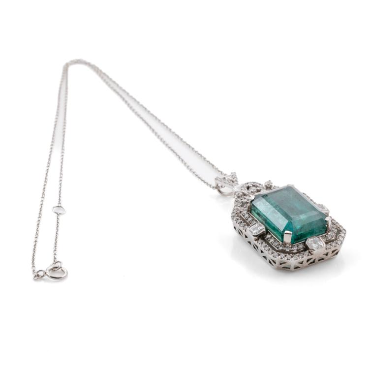Emerald and Diamond pendant with emerald cut natural Zambian Emerald of 27.42ct (with GIA Report #1449974015) and round & square emerald cut natural Diamonds totalling approximately 2.50ct (Estimated grading: G-H VS-SI). 18ct white gold with 45cm 18ct white gold adjustable chain. Weight: 21.6g. (Pre-owned)