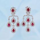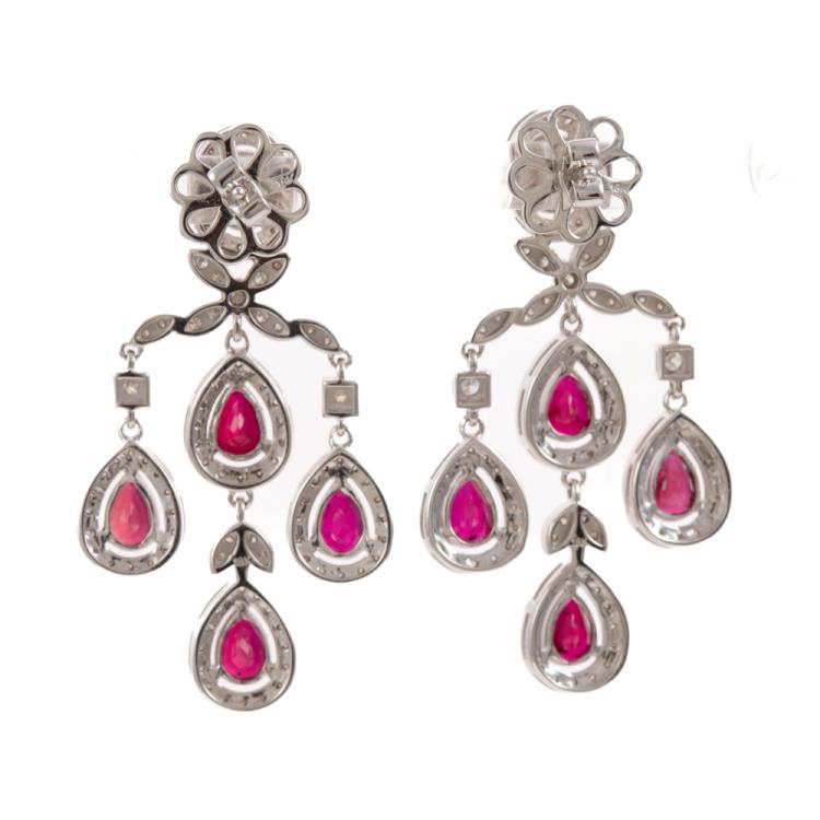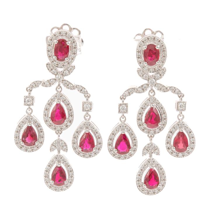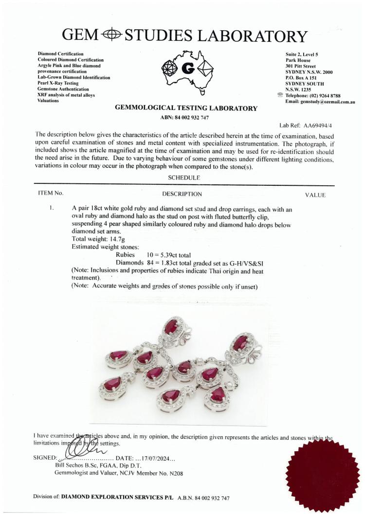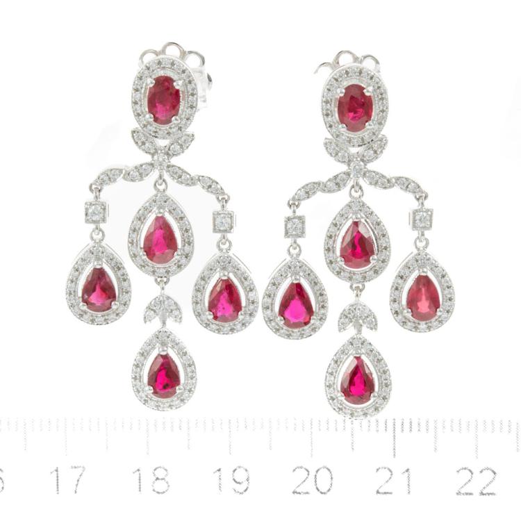Ruby and Diamond chandelier design earrings with pear shape Thai Natural Rubies totalling 5.39ct and round Natural Diamonds totalling 1.83ct (Estimated grading: G-H VS-SI). 18ct white gold. Weight: 14.7g. With GSL Description Report #AA69494/4. (As New)