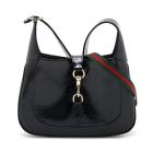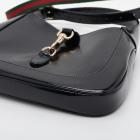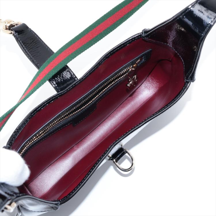 Gucci Jackie small shoulder bag in black patent leather. Featuring light gold-toned hardware, new designed hook lock closure at front. Ancora leather lining interior with a zip pocket with Gucci Crest zip puller. Approximate Dimensions: 27cm(L) x 19cm(H) x 3.5cm(D), 17.5cm handle height, 52cm shoulder drop with the detachable web strap. Accompanied by Gucci purchase receipt, new version dust bag, box. With Entrupy Certificate of Authenticity. (Pre-owned)