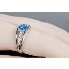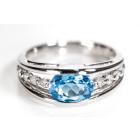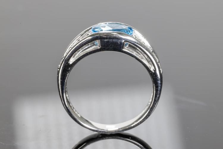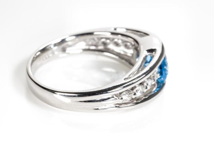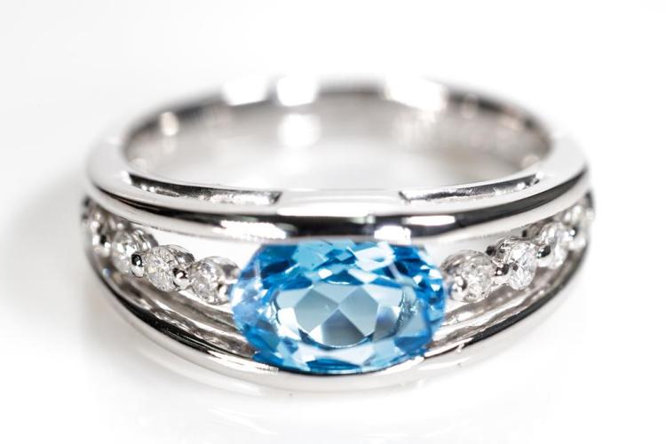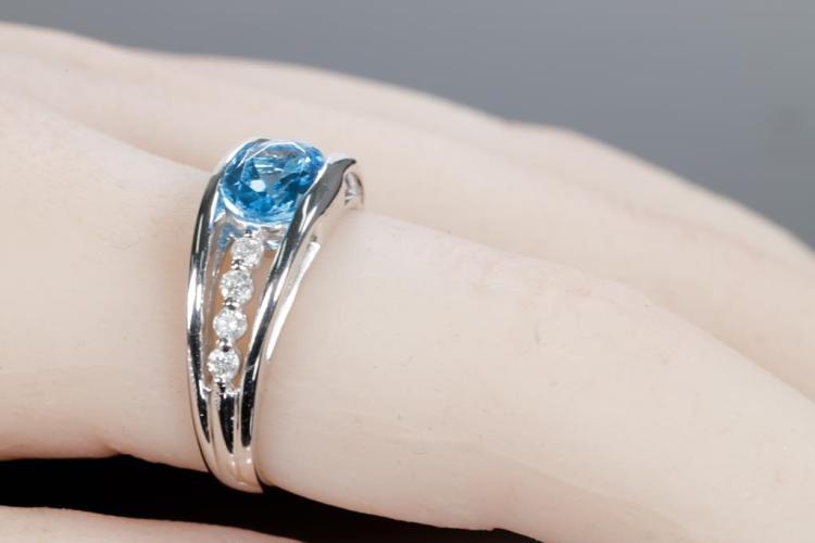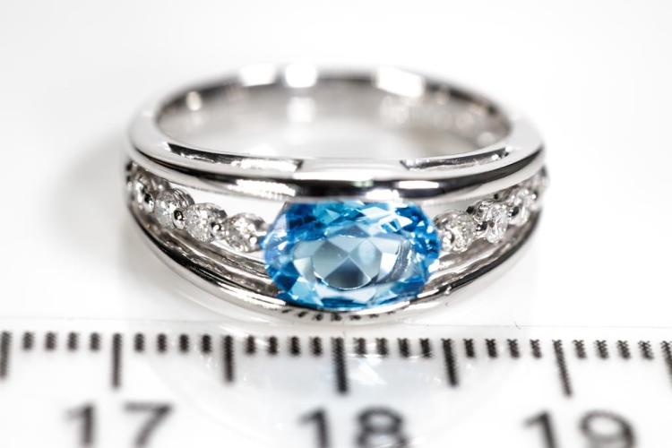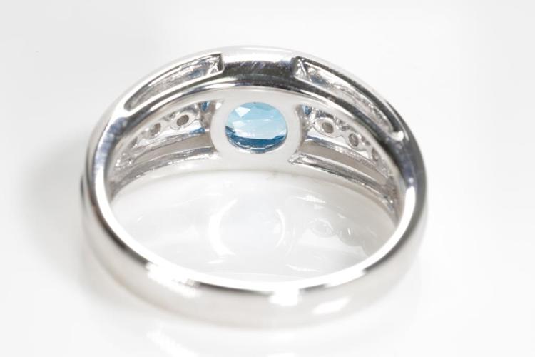Topaz and Diamond ring with an oval shape blue Topaz of 1.19ct and round Diamonds totalling 0.18cts. Platinum-900. Ring size L1/2 - ring resizing is not recommended. Weight: 6.4g. (Pre-owned)