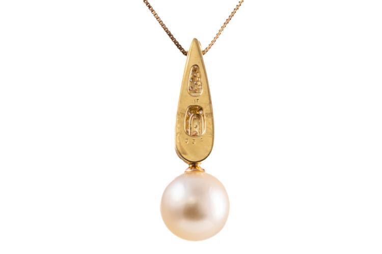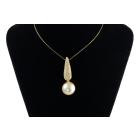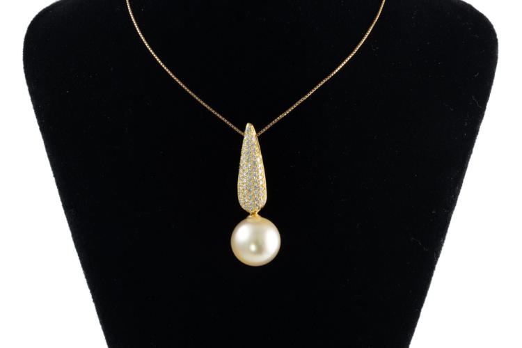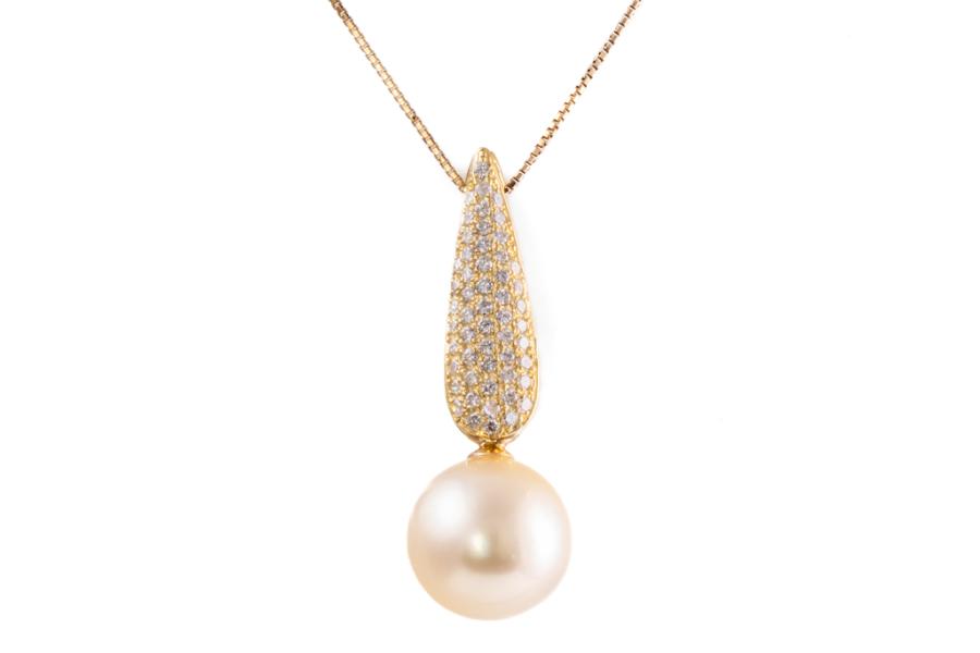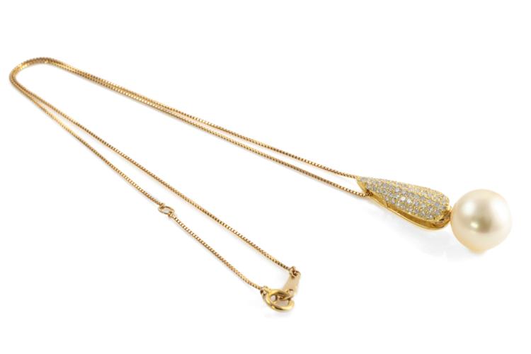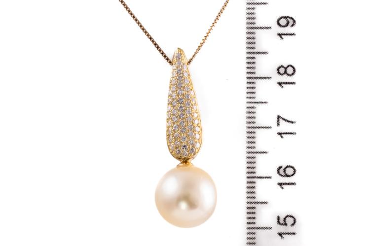 Pearl and Diamond pendant with light golden South Pearl of 12.2mm and round Natural Diamonds totalling 0.54cts (Estimated grading: G-H SI). 18ct yellow gold. Length: 39cm. Weight: 7.4g. (Pre-owned)