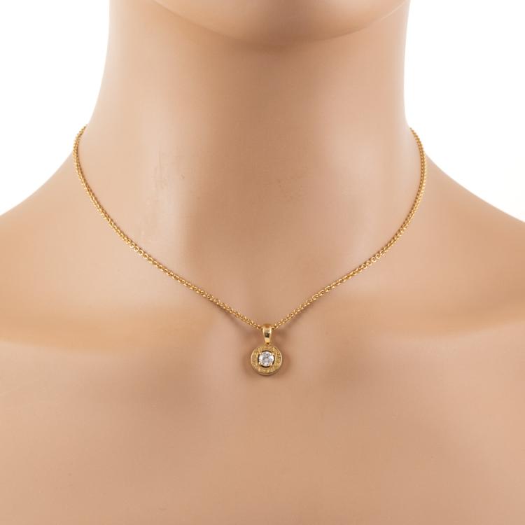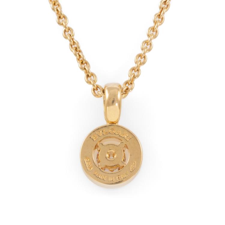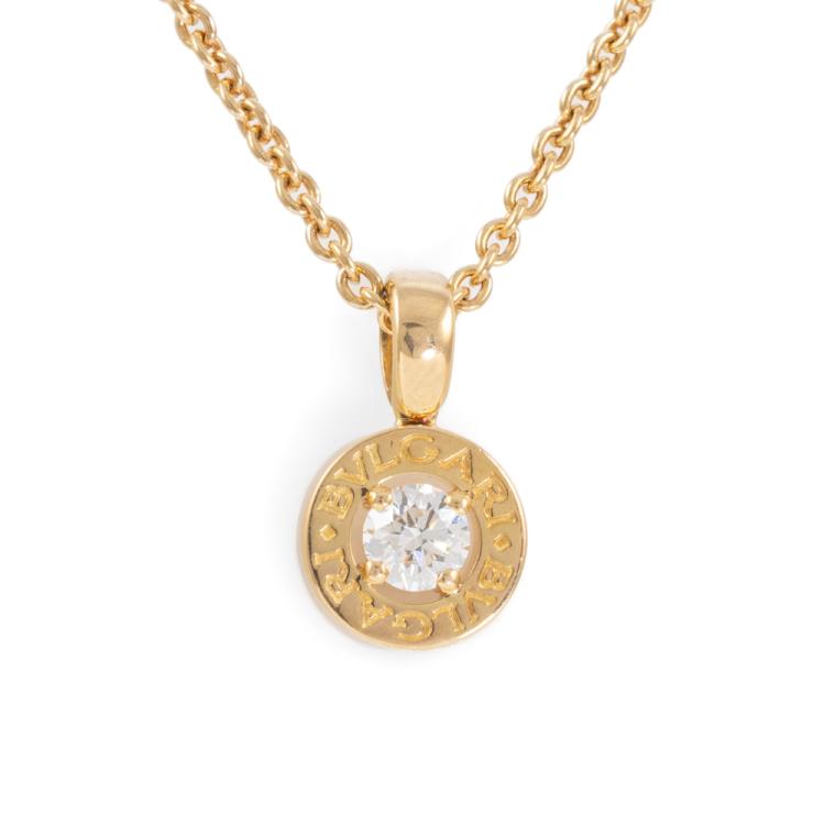 Bvlgari Bvlgari Diamond necklace with round natural Diamond totalling 0.32ct (with copy of GIA Report graded as F VS2 #13605709). Motif Diameter 9.2mm. 18ct yellow gold with adjustable 40.5cm 18ct yellow gold Bvlgari chain. Made in Italy. Weight: 8.1g. With Bvlgari box. (Pre-owned)
