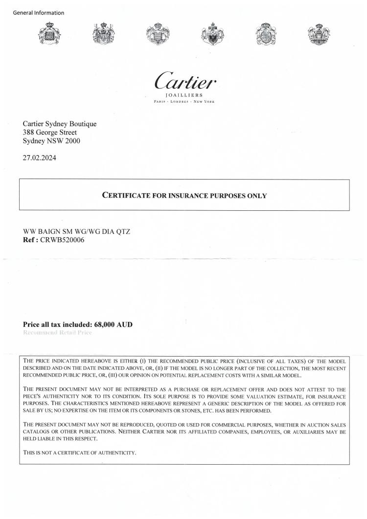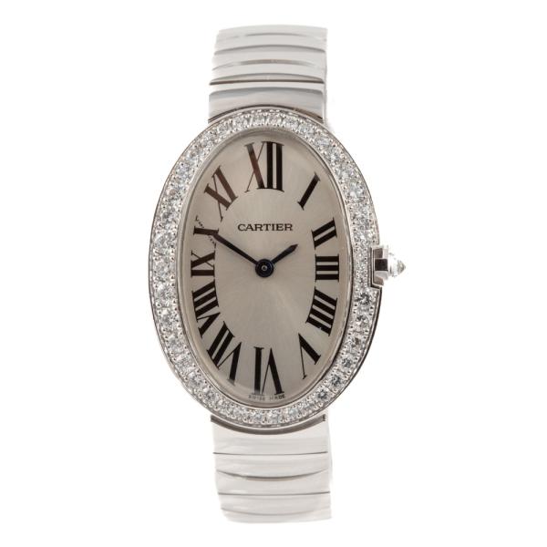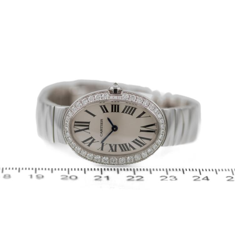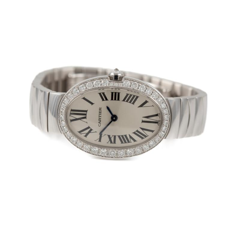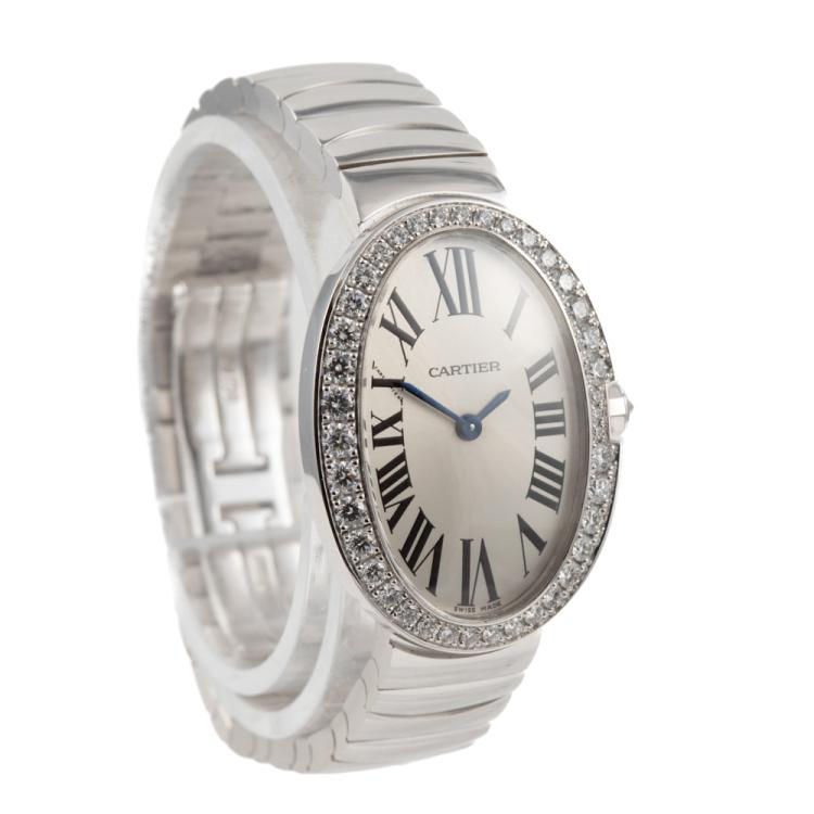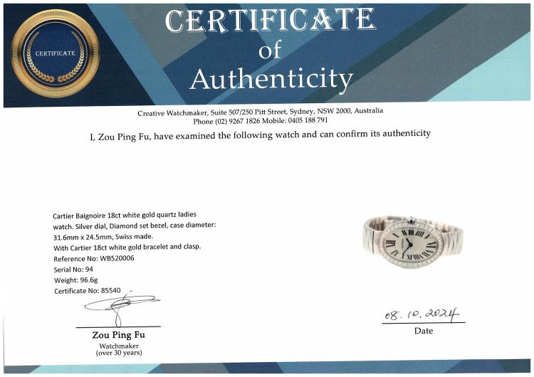 Cartier Baignoire 18ct white gold quartz ladies watch. Silver dial, Diamond set bezel, case diameter: 31.6mm x 24.5mm, wrist size: 13cm, Swiss made. Ref# WB520006. With Cartier 18ct white gold bracelet and clasp. With Certificate of Authenticity, Cartier Valuation Certificate dated 27/02/2024 and Cartier case with Cartier gift bag. 3 month FSA warranty (Pre-owned)