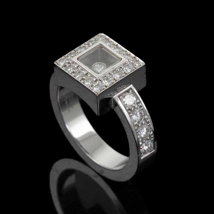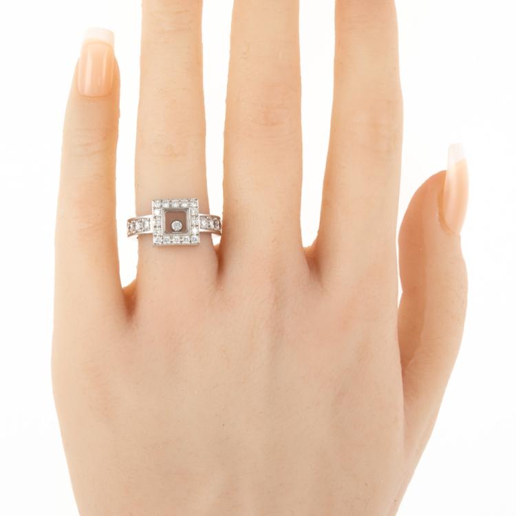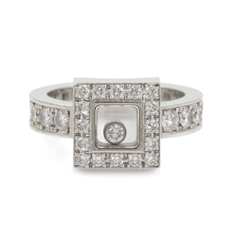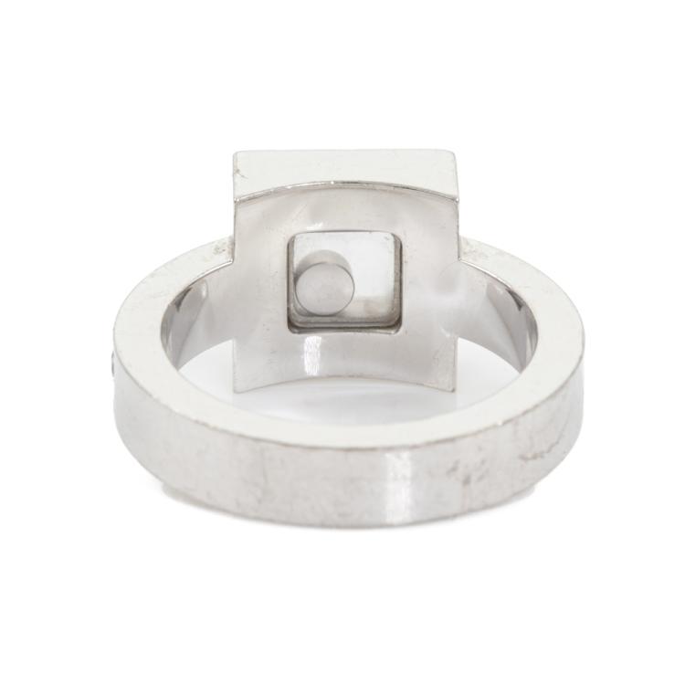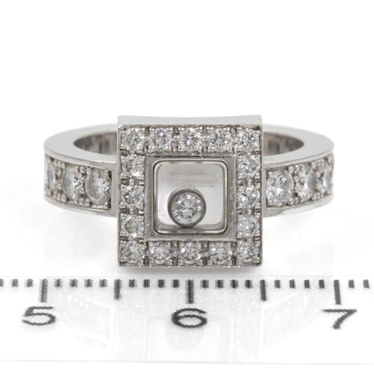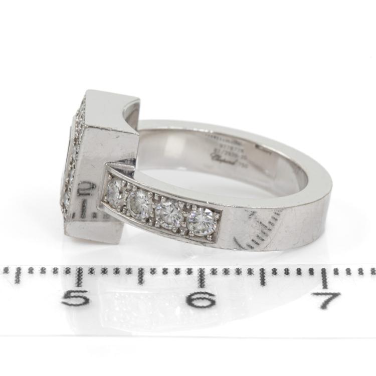 Chopard Happy Diamond Square ring with round Natural Diamonds totalling approximately 0.80cts (Estimated grading F-G VS). Square size: 10.1mm x 10.1mm. 18ct white gold. Ring size K1/4. Band width: 3.9mm. Weight: 10.8g. (Pre-owned)