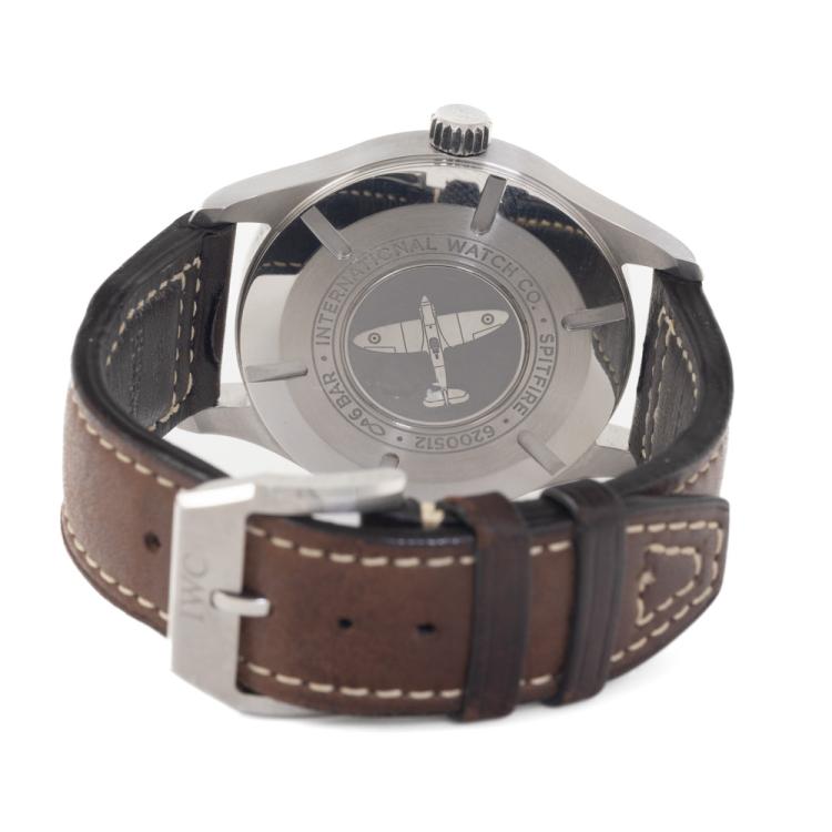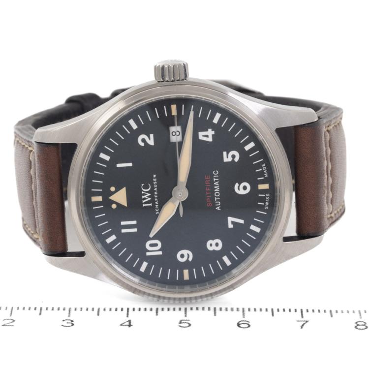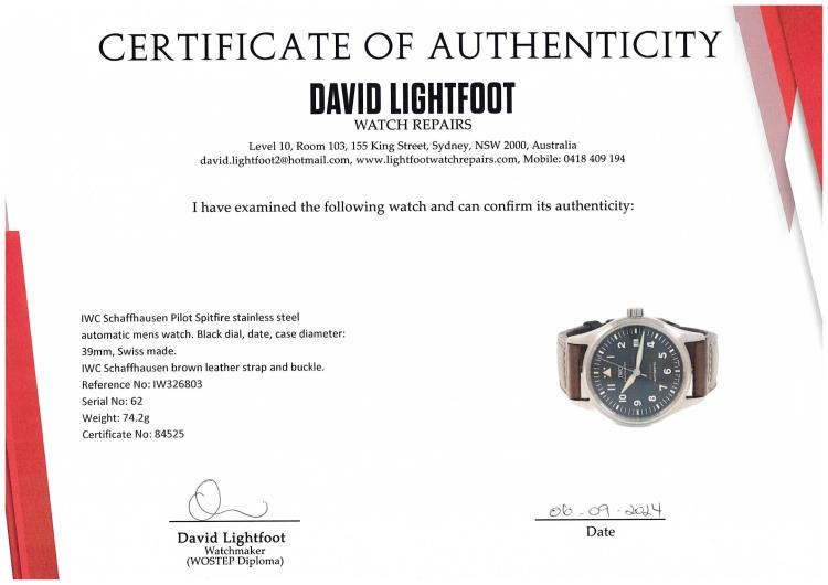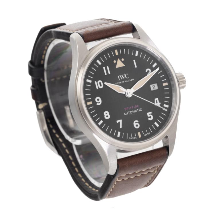 IWC Schaffhausen Pilot Spitfire stainless steel automatic mens watch. Black dial, date, case diameter: 39mm, strap length: 21cm, Swiss made. Ref# IW326803. With IWC Schaffhausen brown leather strap and buckle. With Certificate of Authenticity IWC Schaffhausen Service Invoice dated 29/05/2024 and IWC Schaffhausen case. 3 month FSA warranty. (Pre-owned)