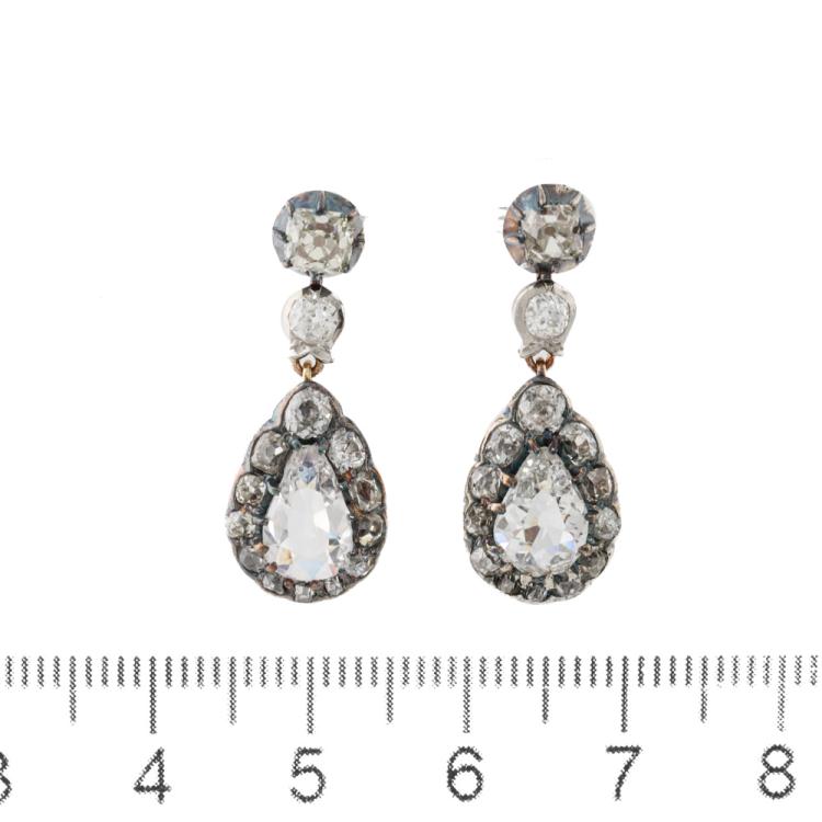 Kozminsky antique Georgian Diamond drop earrings with 2 pear shape Natural Diamonds totalling approximately 1.20ct (Estimated grading: H-I SI-P1) and 28 old mine cut Natural Diamonds totalling approximately 2.00ct (Estimated grading: I-J & K-M SI-P2). Set in Silver, 18ct yellow gold and Platinum 750 with one platinum 900 back and one 18ct white gold back. Drop length: 2.6cm. Weight: 4.7g. With Kozminsky box. (Pre-owned)