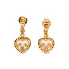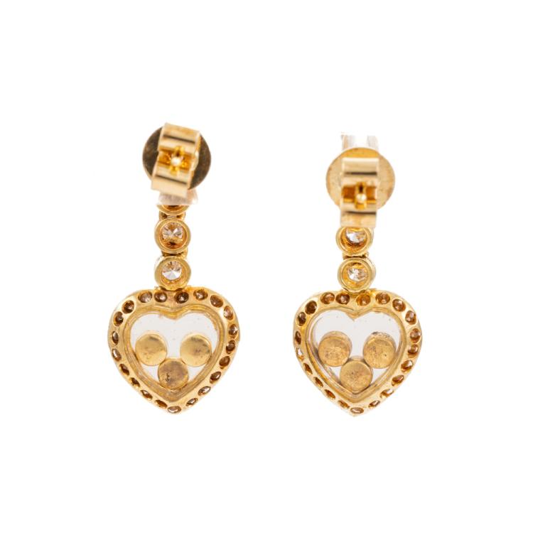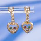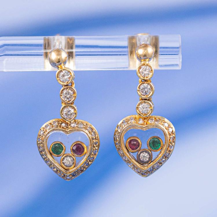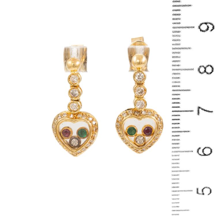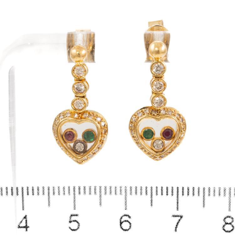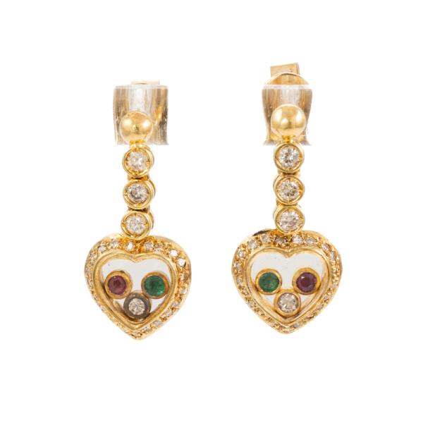 Heart shape drop earrings with round Natural Emeralds totalling approx. 0.04cts, round Natural Rubies totalling approx. 0.04cts and round Natural Diamonds totalling 1.06cts (Estimated grading: H-I SI). 18ct yellow gold. Weight: 5.8g. (Pre-owned)