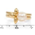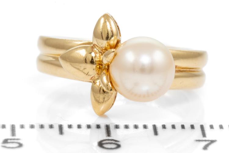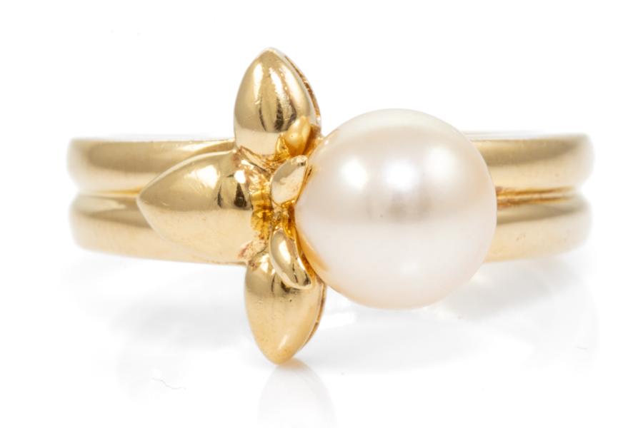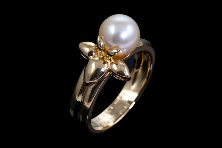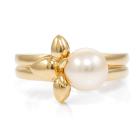 Van Cleef & Arpels Pearl Flower ring with white cultured Pearl of 7mm. 18ct yellow gold. Ring size J. Weight: 5.5g. (Pre-owned)